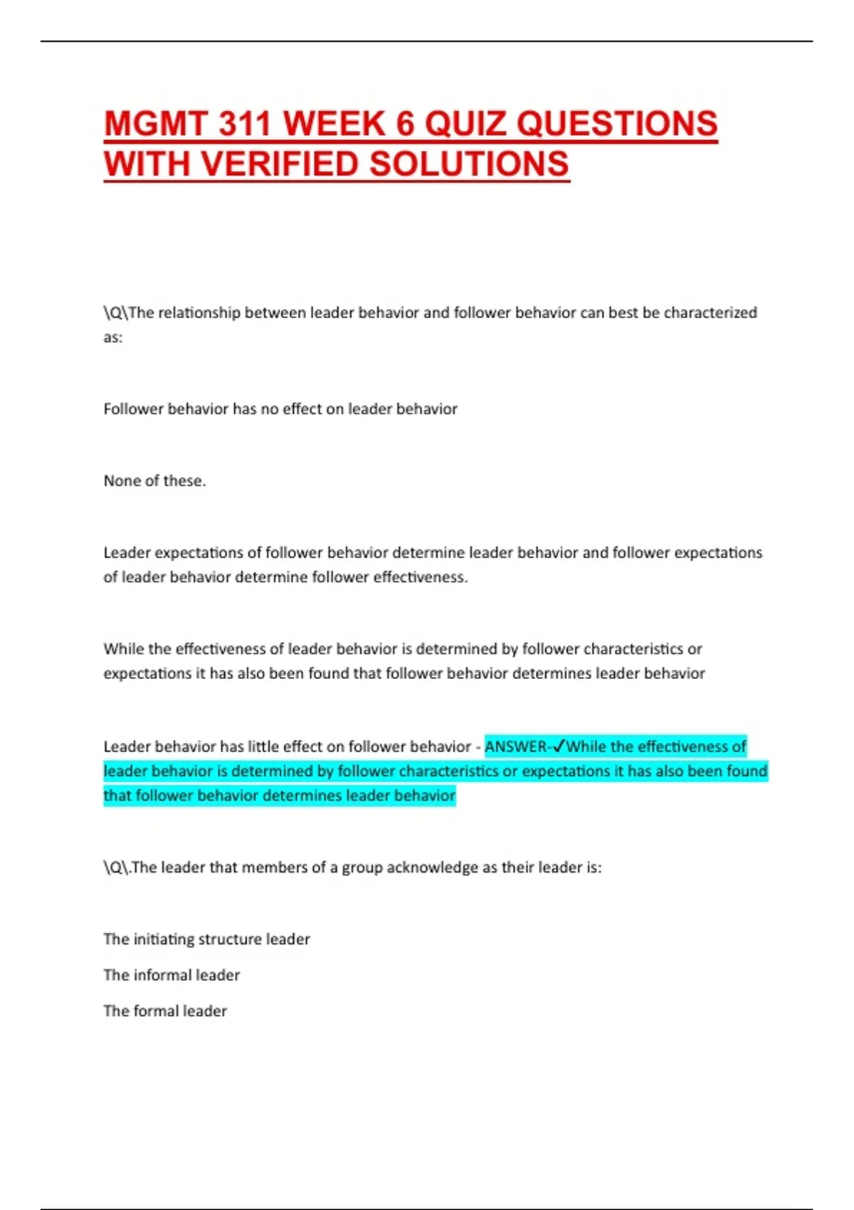 1 Exam (elaborations) MGMT 311 WEEK 6 QUIZ QUESTIONS WITH VERIFIED SOLUTIONS 2 Exam (elaborations) MGMT 311 WEEK 3 QUIZ QUESTIONS WITH VERIFIED SOLUTIONS 3 Exam (elaborations) MGMT 311 WEEK 4 QUIZ QUESTIONS WITH VERIFIED SOLUTIONS 4 Exam (elaborations) MGMT 311 WEEK 5 QUIZ QUESTIONS WITH VERIFIED SOLUTIONS 5 Exam (elaborations) MGMT 311 EXAM 1