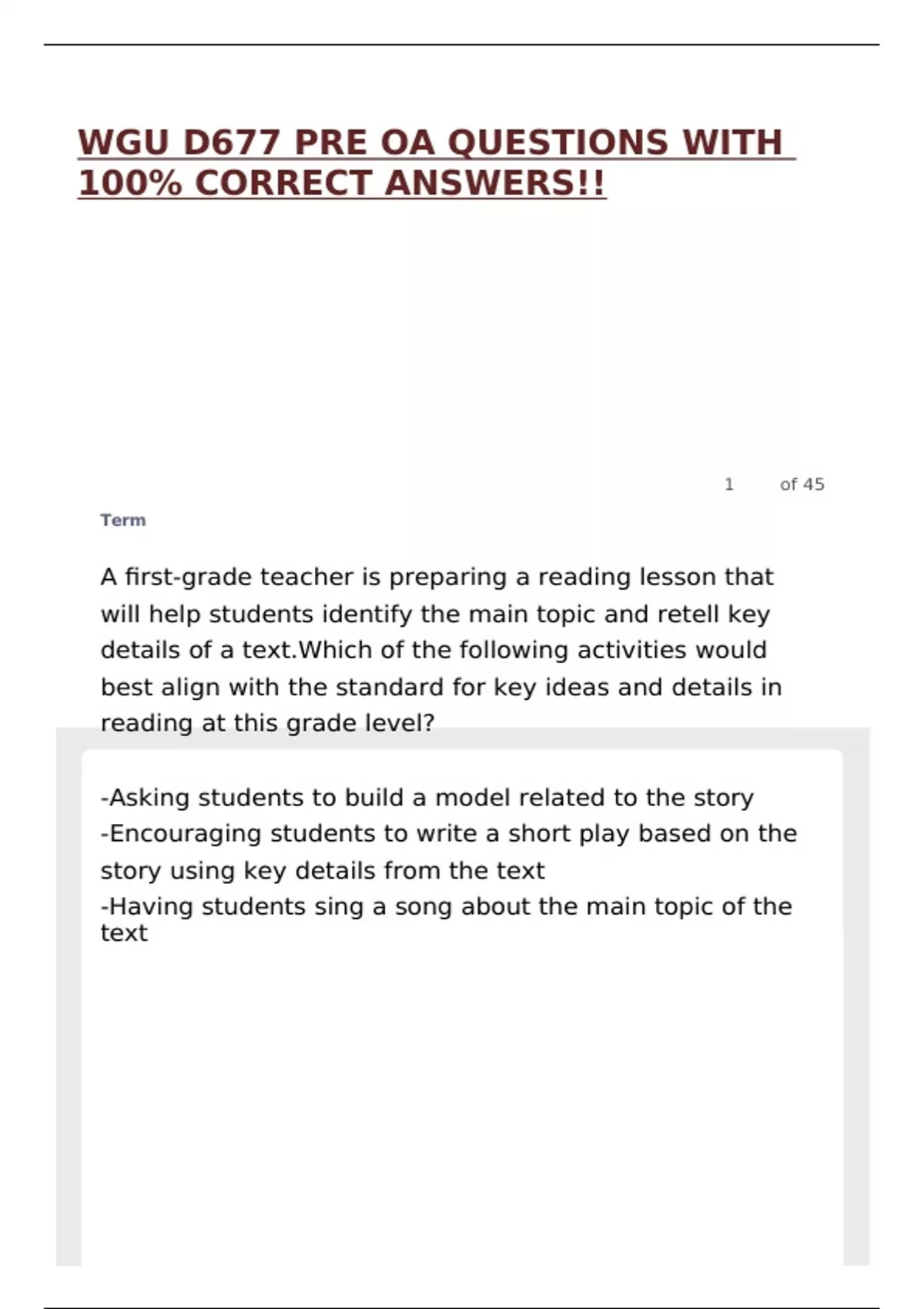 D677 WGU LATEST 2025 UPDATE | QUESTIONS AND ANSWERS | ALREADY PASSED!!,WGU D677 PRE OA QUESTIONS WITH 100% CORRECT ANSWERS!!,WGU D677- ELEMENTARY LITERACY CURRICULUM (SOLVED) CORRECTLY TO PASS!!