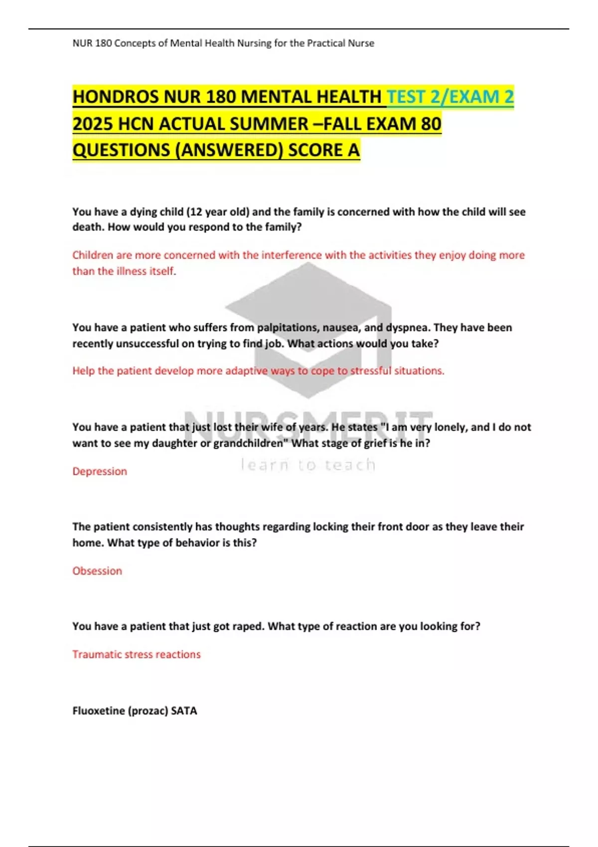 HONDROS NUR 180 MENTAL HEALTH TEST 2/EXAM 2 2025 HCN ACTUAL SUMMER –FALL EXAM 80 QUESTIONS (ANSWERED) SCORE A