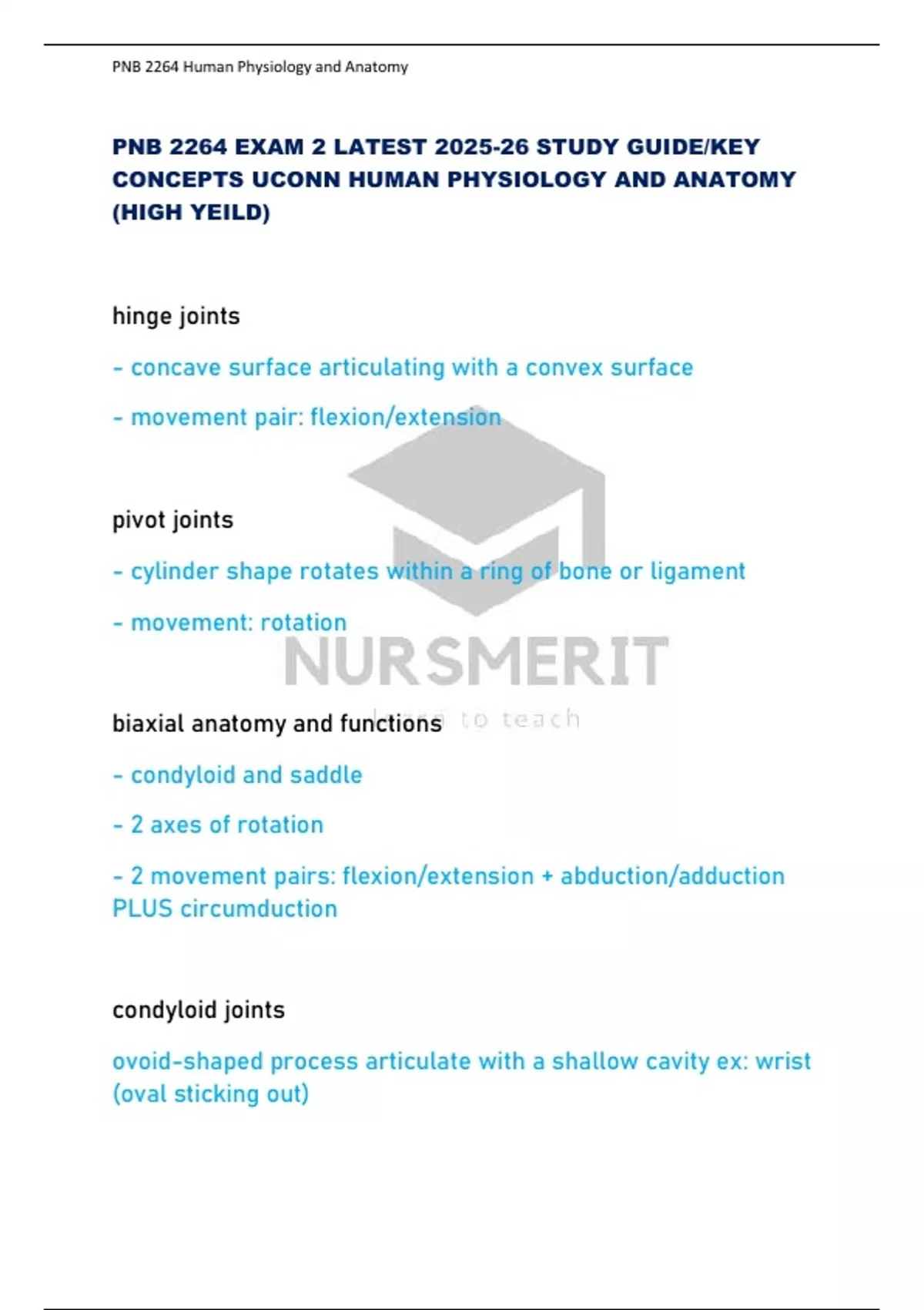 PNB 2264 EXAM 2 LATEST 2025-26 STUDY GUIDE/KEY CONCEPTS UCONN HUMAN PHYSIOLOGY AND ANATOMY (HIGH YEILD)