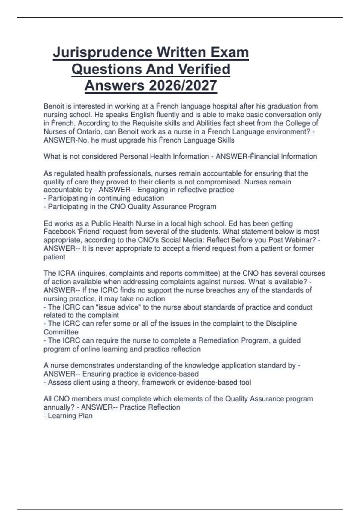 Package deal for Jurisprudence Jurisprudence Written Exam Questions And Verified Answers 2026/2027