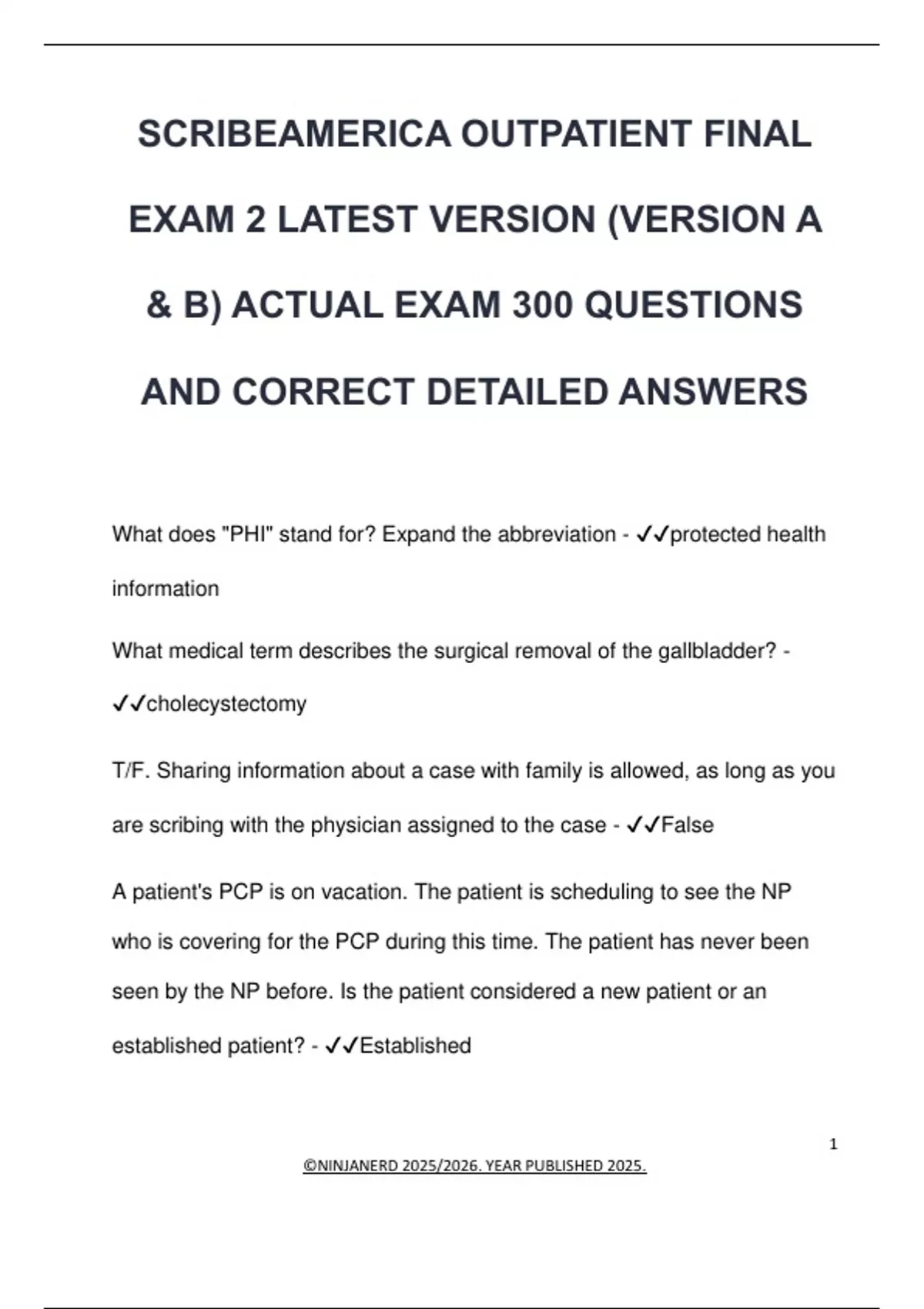 SCRIBEAMERICA OUTPATIENT FINAL EXAM 2 LATEST VERSION (VERSION A & B) ACTUAL EXAM 300 QUESTIONS AND CORRECT DETAILED ANSWERS