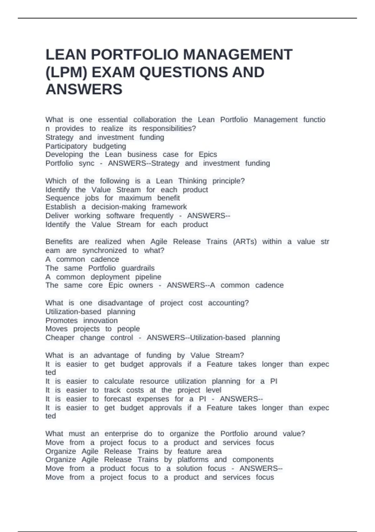 Lean Portfolio Management (LPM) - 77% EXAM QUESTIONS AND ANSWERS