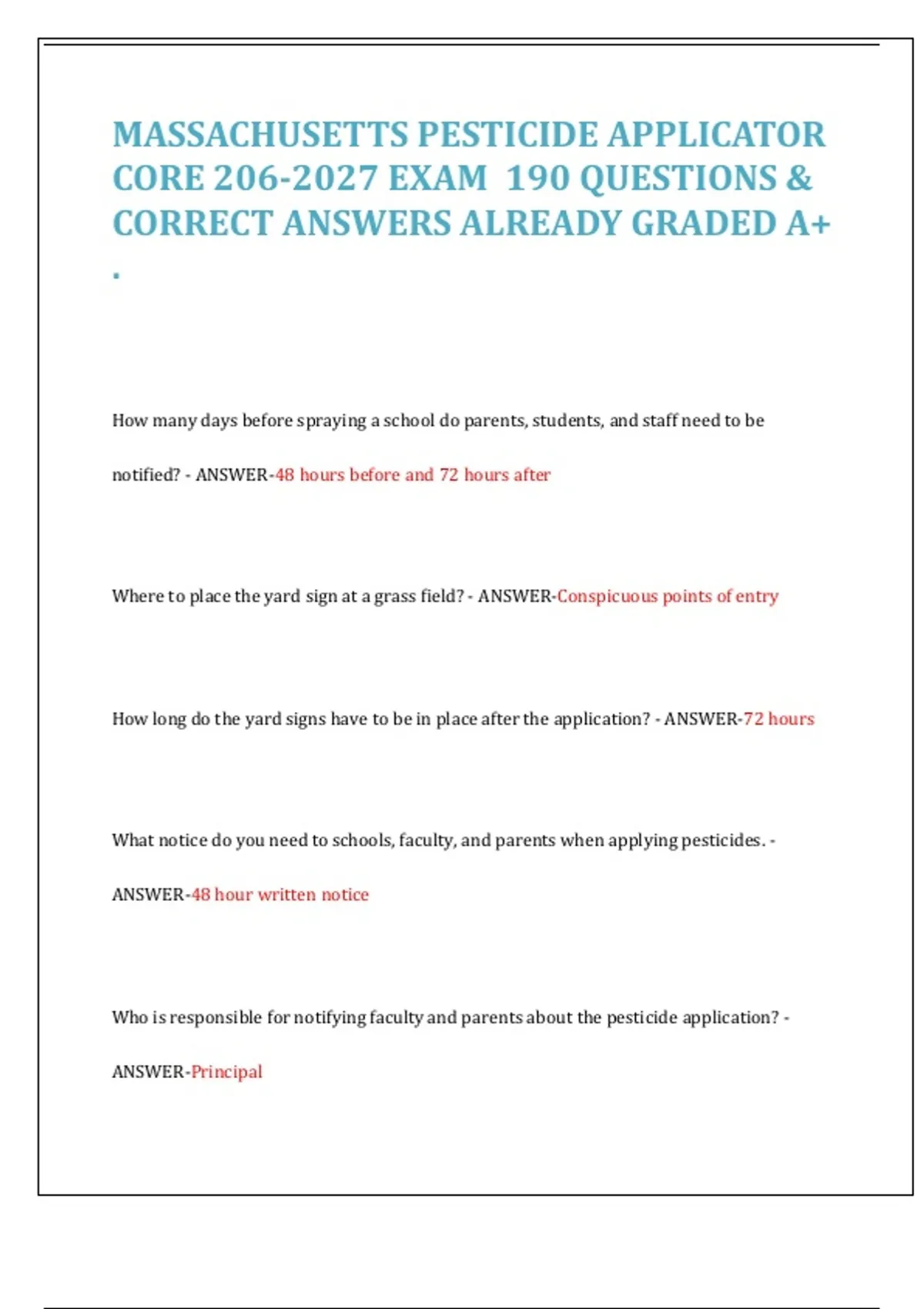 Massachusetts Pesticide Applicator Core 206 Exam Study Guide (2027) – 190 Q&A | School IPM, Safety & Regulations Massachusetts Pesticide Exam Study Guide – 150 Questions & Verified Answers () Massachusetts Pesticide Applicator Test: 150-Question Study Guide with Verified Answers