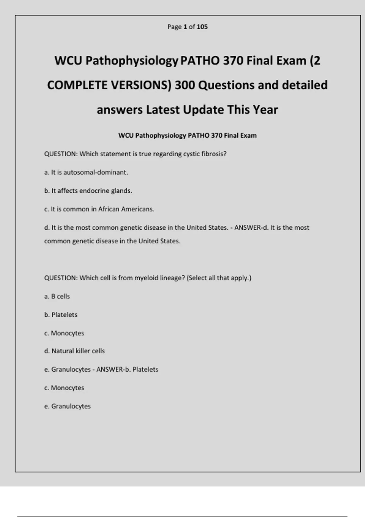 WCU Pathophysiology PATHO 370 Final Exam (2 COMPLETE VERSIONS) 300 Questions and detailed answers Latest Update This Year