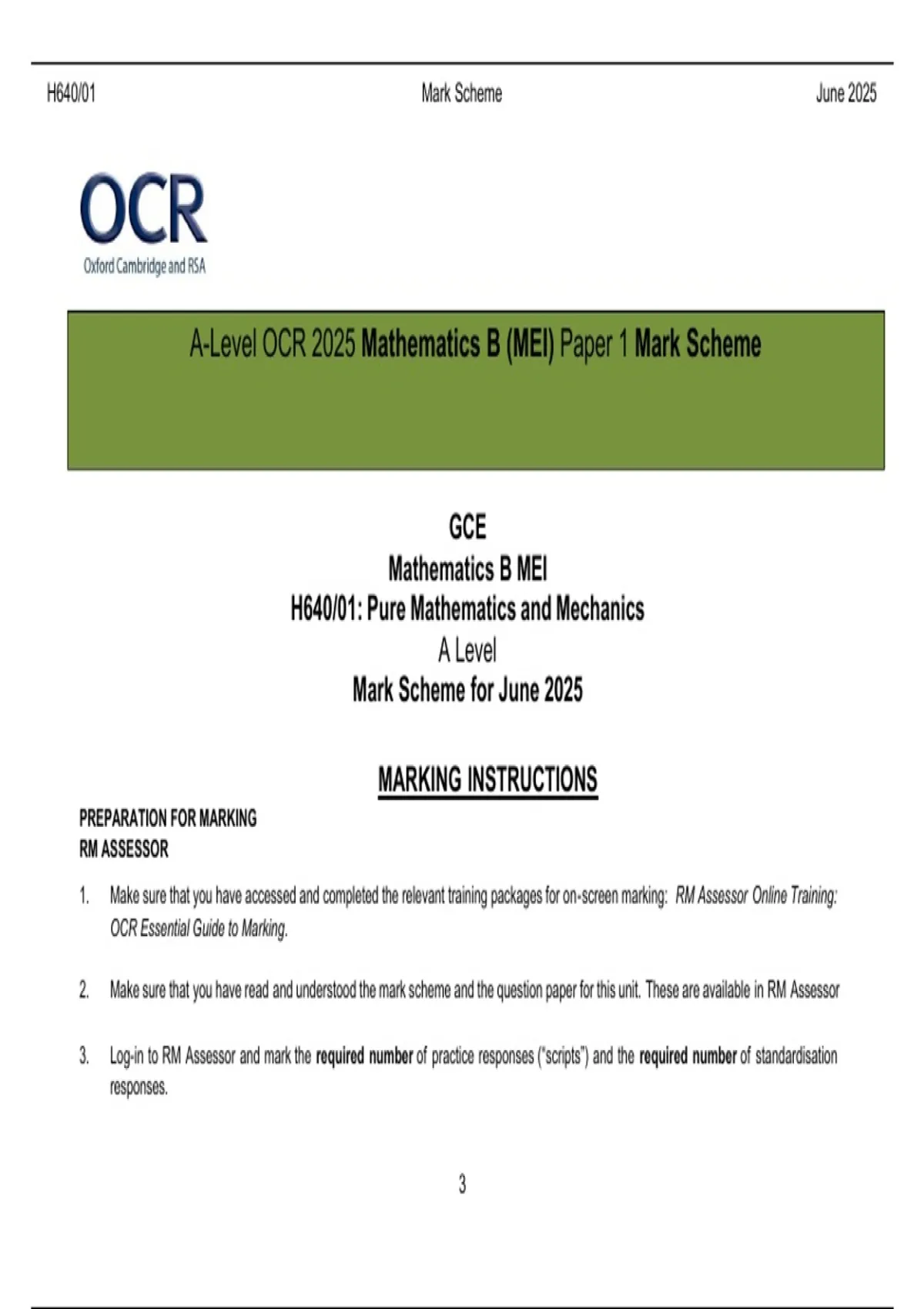 A-Level OCR 2025 Mathematics B (MEI) Paper 1, 2 & 3 Mark Schemes Only