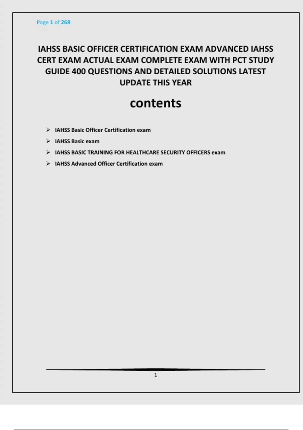 IAHSS BASIC OFFICER CERTIFICATION EXAM ADVANCED IAHSS CERT EXAM ACTUAL EXAM COMPLETE EXAM WITH PCT STUDY GUIDE 400 QUESTIONS AND DETAILED SOLUTIONS LATEST UPDATE THIS YEAR