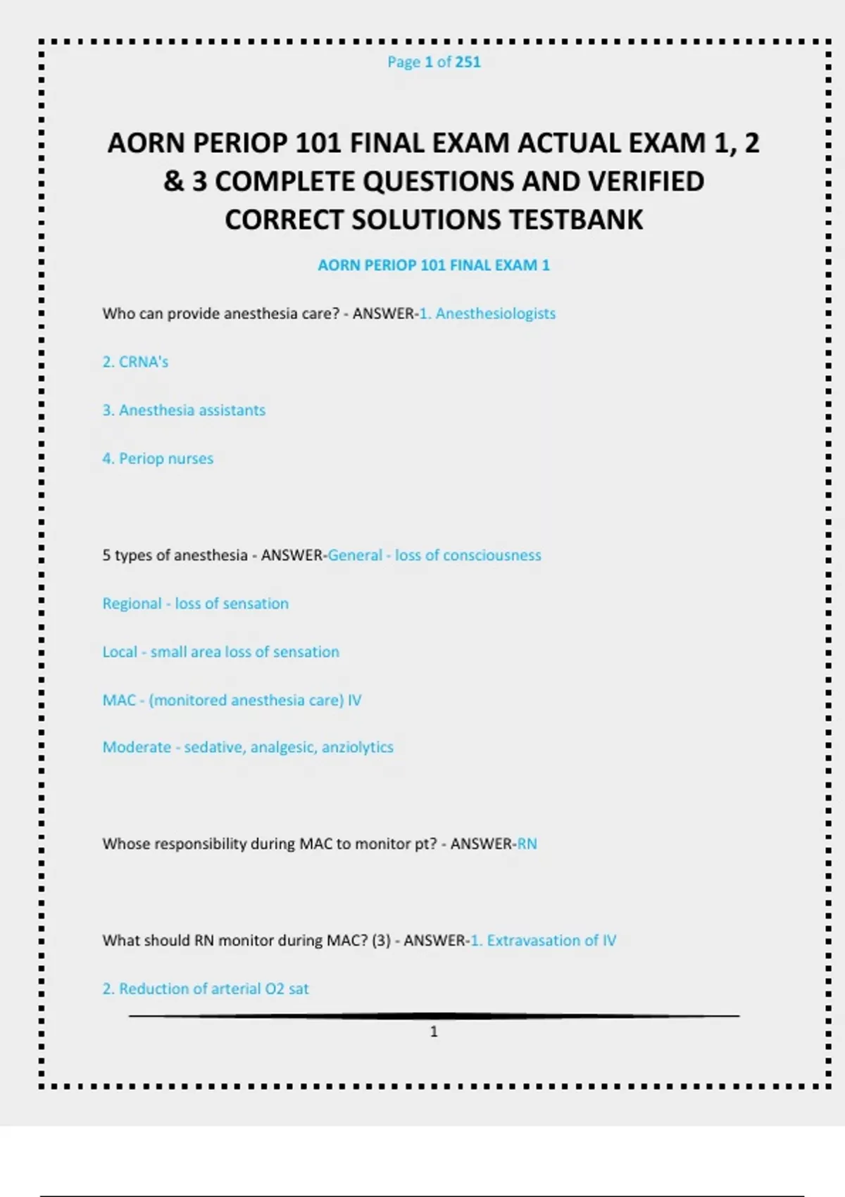 AORN PERIOP 101 FINAL EXAM ACTUAL EXAM 1, 2 & 3 COMPLETE QUESTIONS AND VERIFIED CORRECT SOLUTIONS TESTBANK