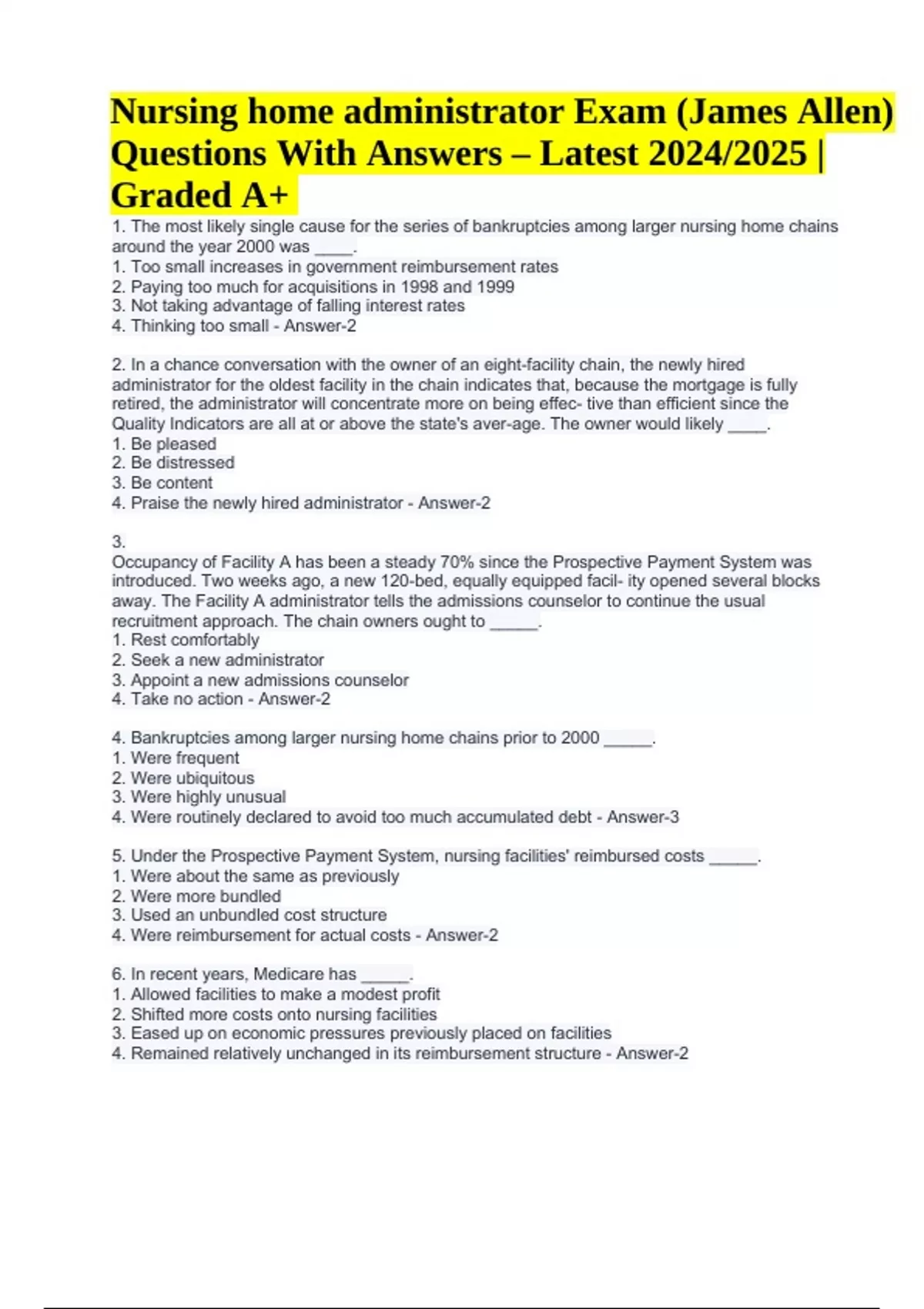 IL Nursing Home Administrator Exam Questions with Correct Answers | (100% Verified) Nursing home administrator Exam (James Allen) Exam Questions With Answers & TEXAS NURSING HOME ADMINISTRATOR EXAM QUESTIONS AND CORRECT ANSWERS – LATEST UPDATE 2026/2027 (