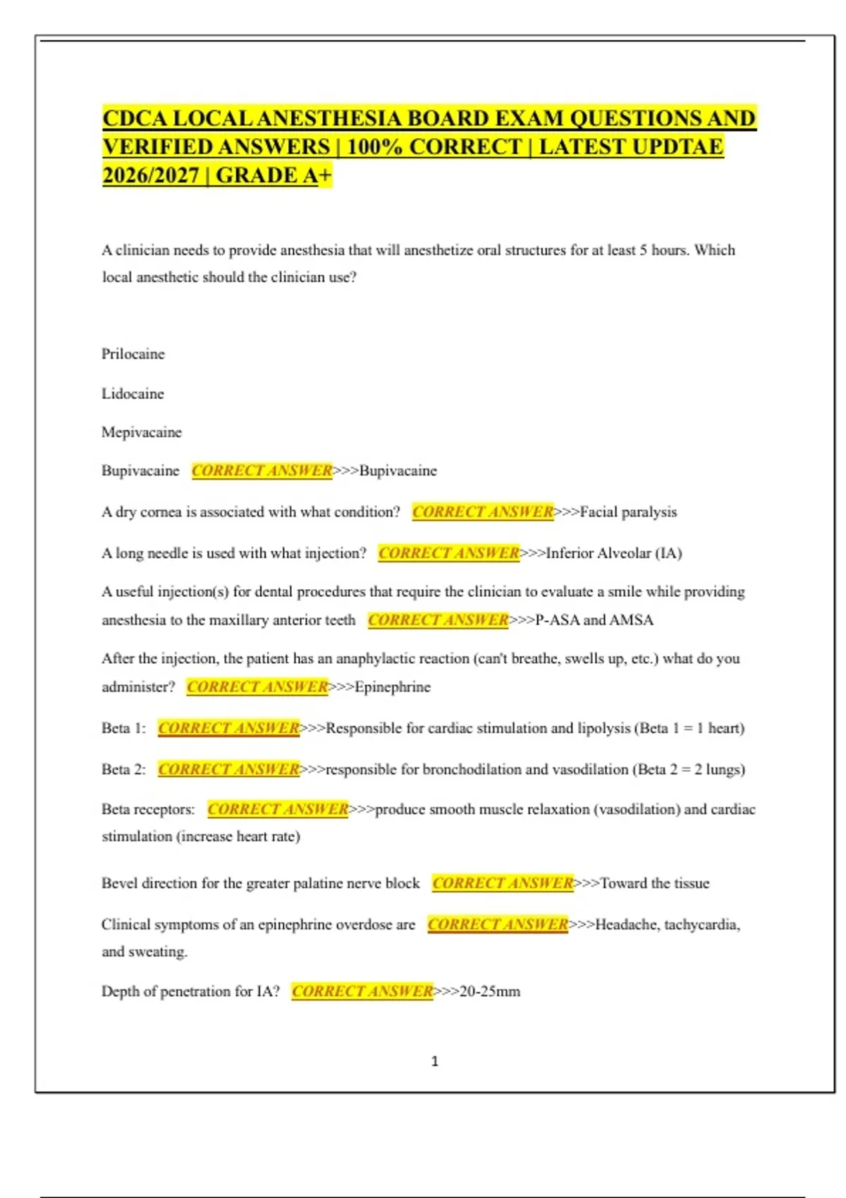 LOCAL ANESTHESIA - CDCA BOARD EXAM Questions and 100% Correct Answers | Latest Update | Guaranteed Pass, Local Anesthesia - CDCA Board Exam Questions and 100% Correct Answers & Local Anesthesia CDCA Exam Questions and Verified Answers – Latest Update 2026/2027 (100% Correct)