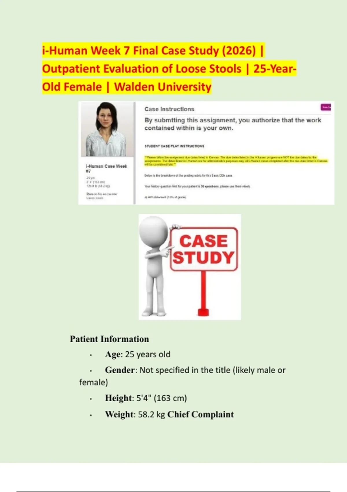 1 Exam (elaborations) Comprehensive i-Human Case Analysis – Week 7 Exam Submission (2026) | 25-Year-Old Female With Loose Stools | Outpatient Clinic With Laboratory Capabilities | Walden University 2 Exam (elaborations) i-Human Week 7 Final Case Study (2026) | Outpatient Evaluation of Loose Stools | 25-YearOld Female | Walden University 3 Exam (