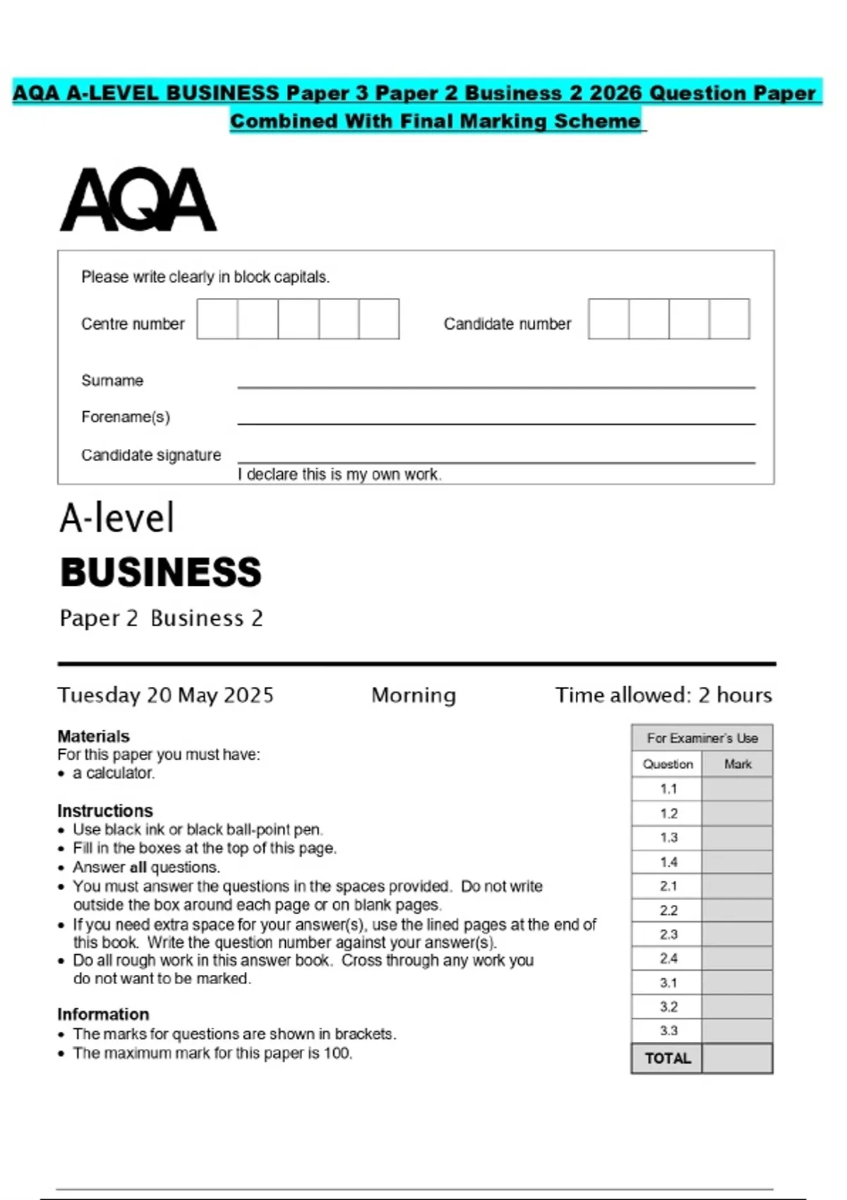 AQA A-LEVEL BUSINESS Paper 3 Paper 2 Business 2 2026 Question Paper Combined With Final Marking Scheme