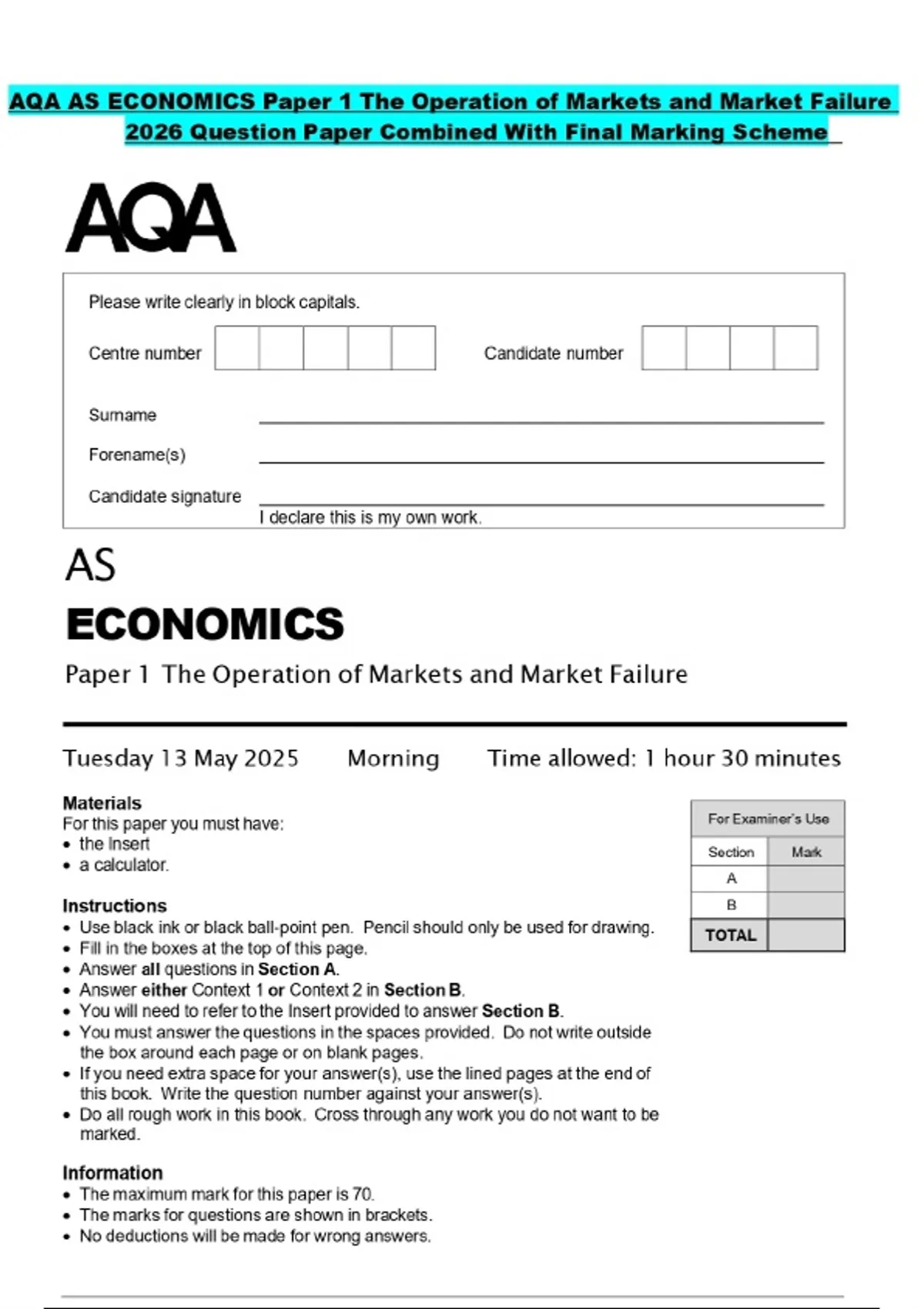 AQA AS ECONOMICS Paper 1 The Operation of Markets and Market Failure 2026 Question Paper Combined With Final Marking Scheme