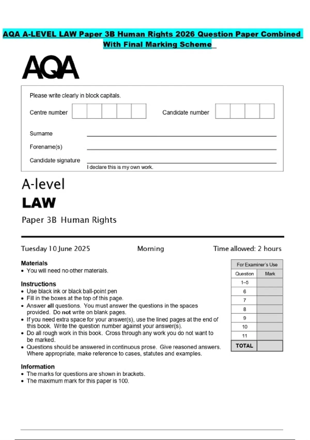 AQA A-LEVEL LAW Paper 3B Human Rights 2026 Question Paper Combined With Final Marking Scheme