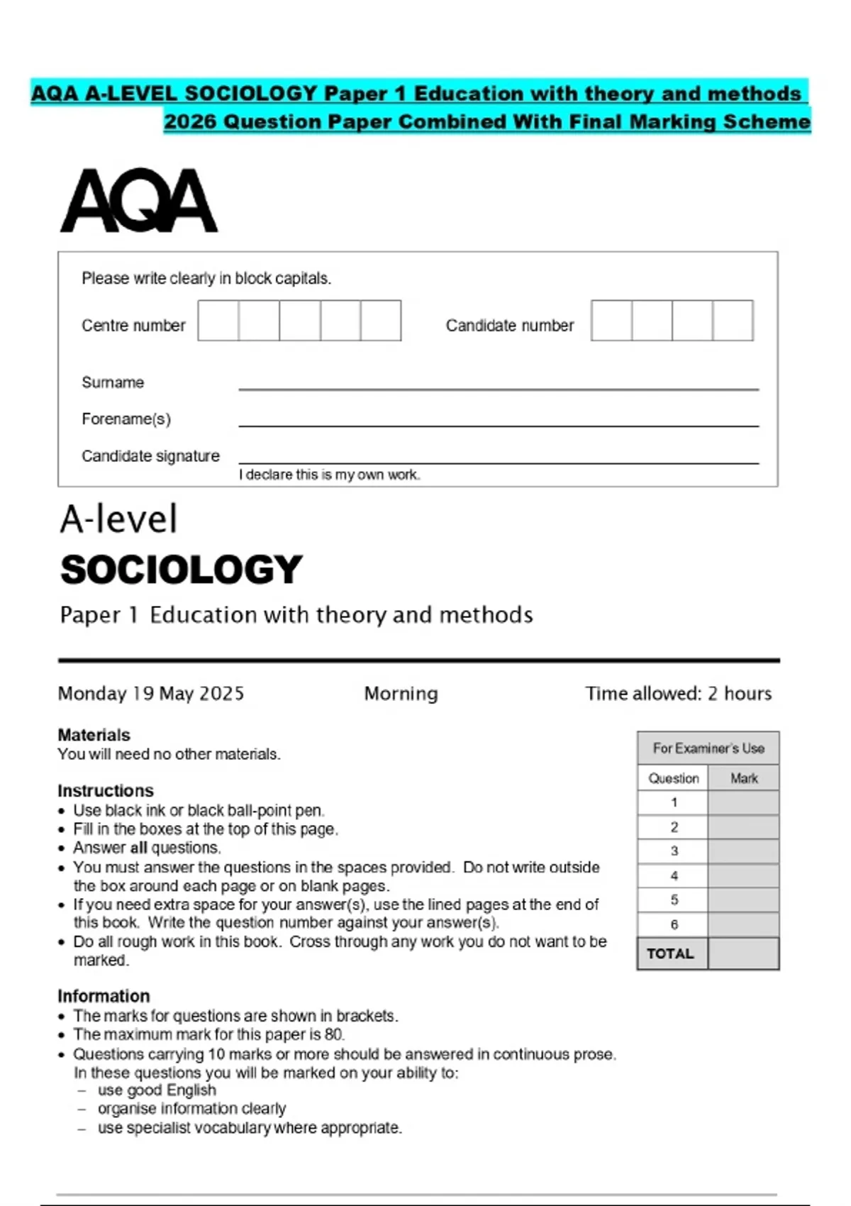 AQA A-LEVEL SOCIOLOGY Paper 1 Education with theory and methods 2026 Question Paper Combined With Final Marking Scheme
