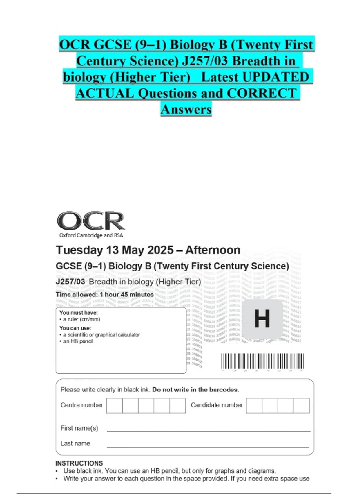 OCR GCSE (9–1) Biology B (Twenty First Century Science) J257/03 Breadth in biology (Higher Tier) Latest UPDATED ACTUAL Questions and CORRECT Answers