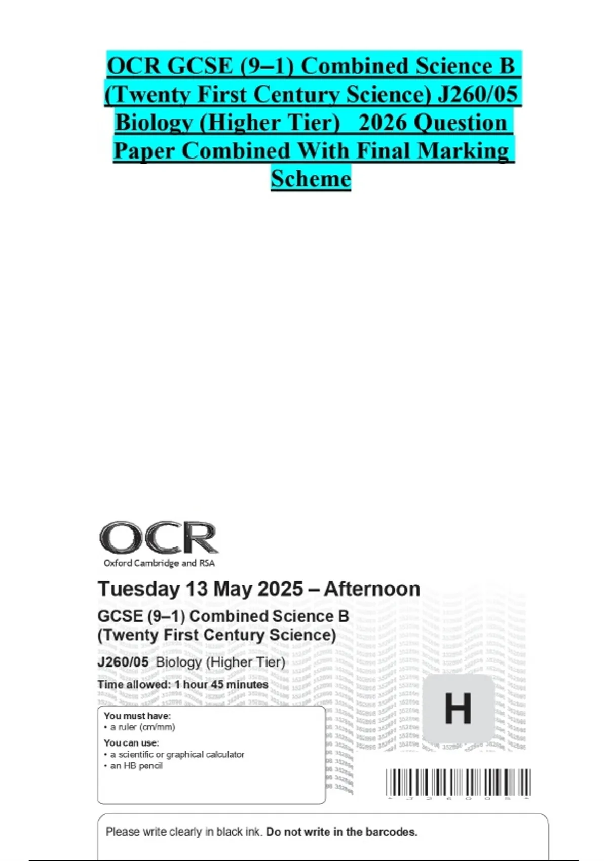 OCR GCSE (9–1) Combined Science B (Twenty First Century Science) J260/05 Biology (Higher Tier) 2026 Question Paper Combined With Final Marking Scheme