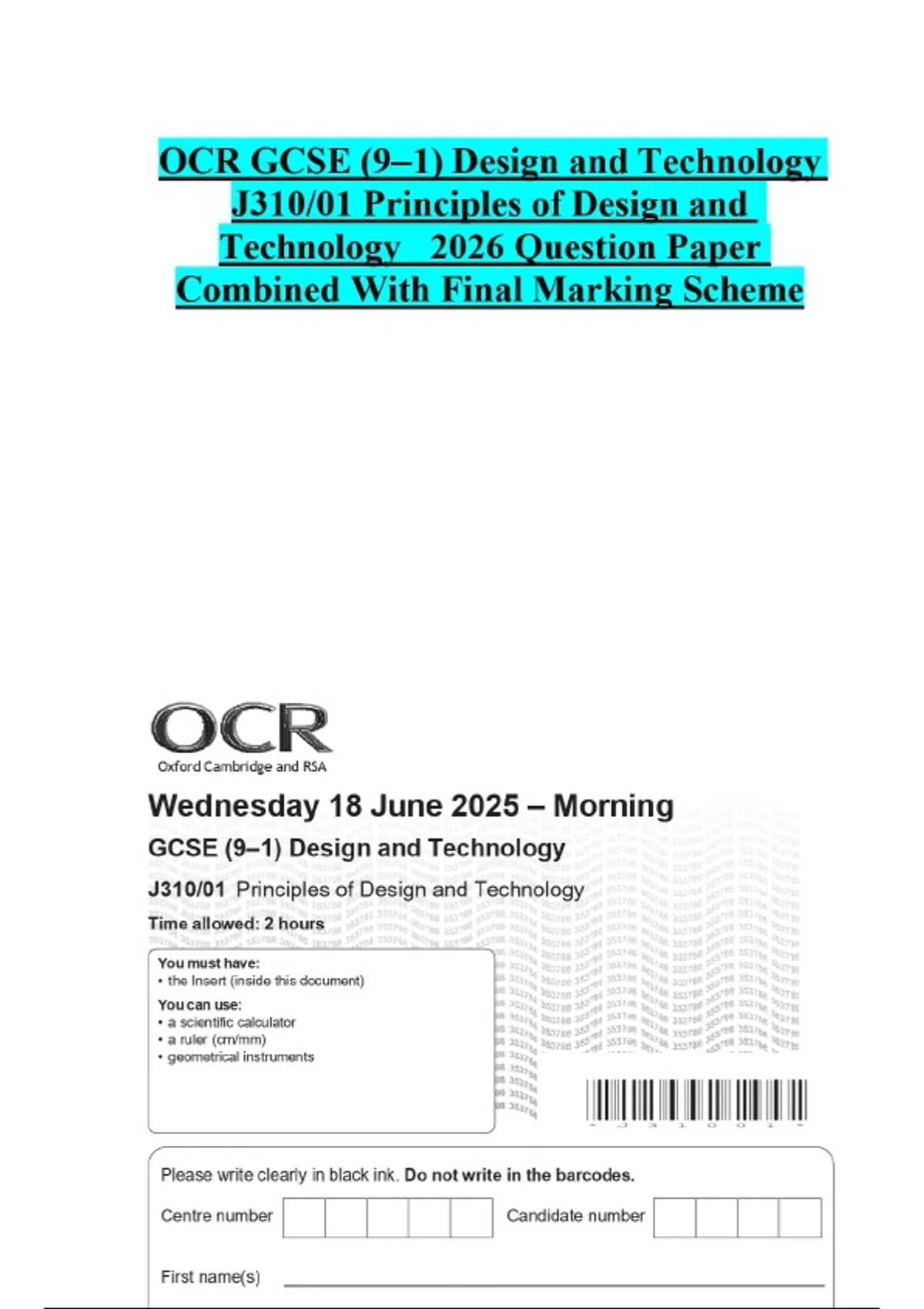 OCR GCSE (9–1) Design and Technology J310/01 Principles of Design and Technology 2026 Question Paper Combined With Final Marking Scheme