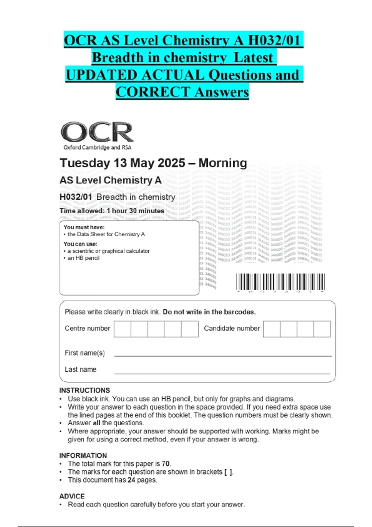 OCR AS Level Chemistry A H032/01 Breadth in chemistry Latest UPDATED ACTUAL Questions and CORRECT Answers