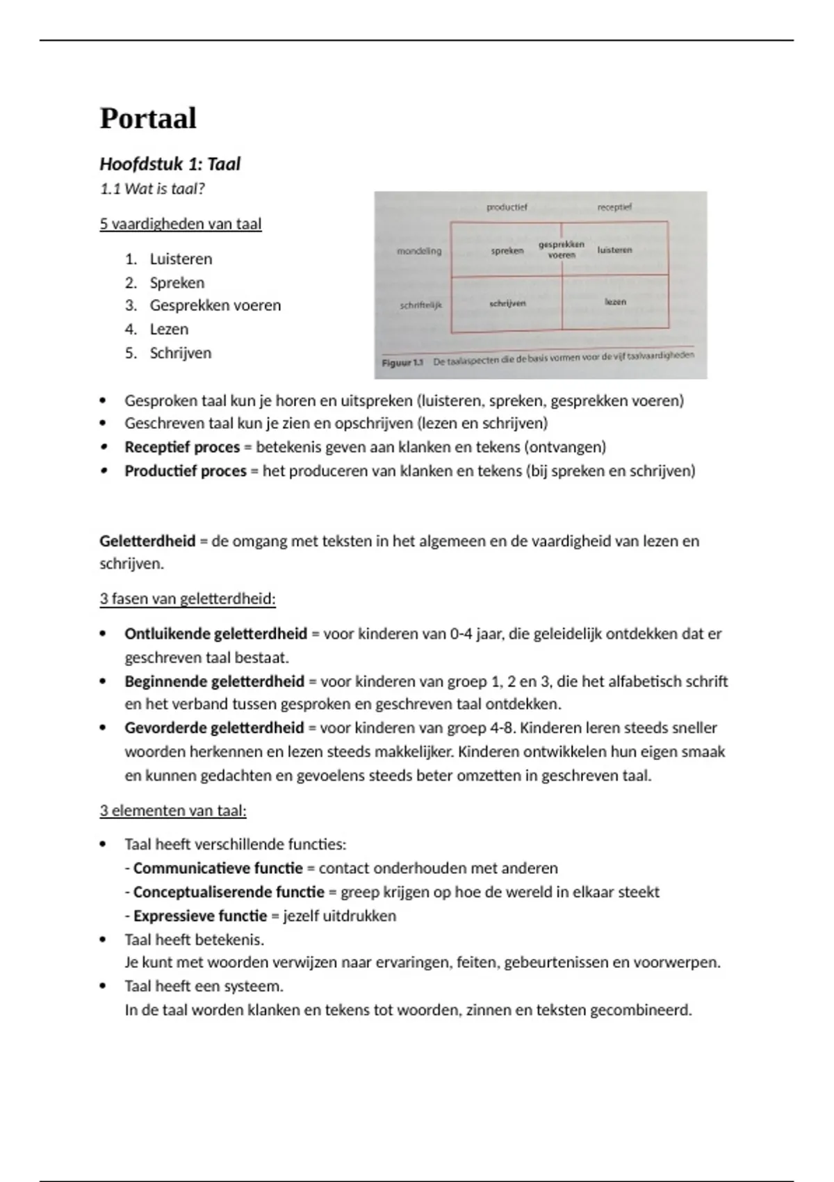 Samengevatte tentamenstof Portaal (hoofdstuk 1, 2, 3, 5, 8, 11 en 12) en Taalontwikkeling op school (gehele boek).