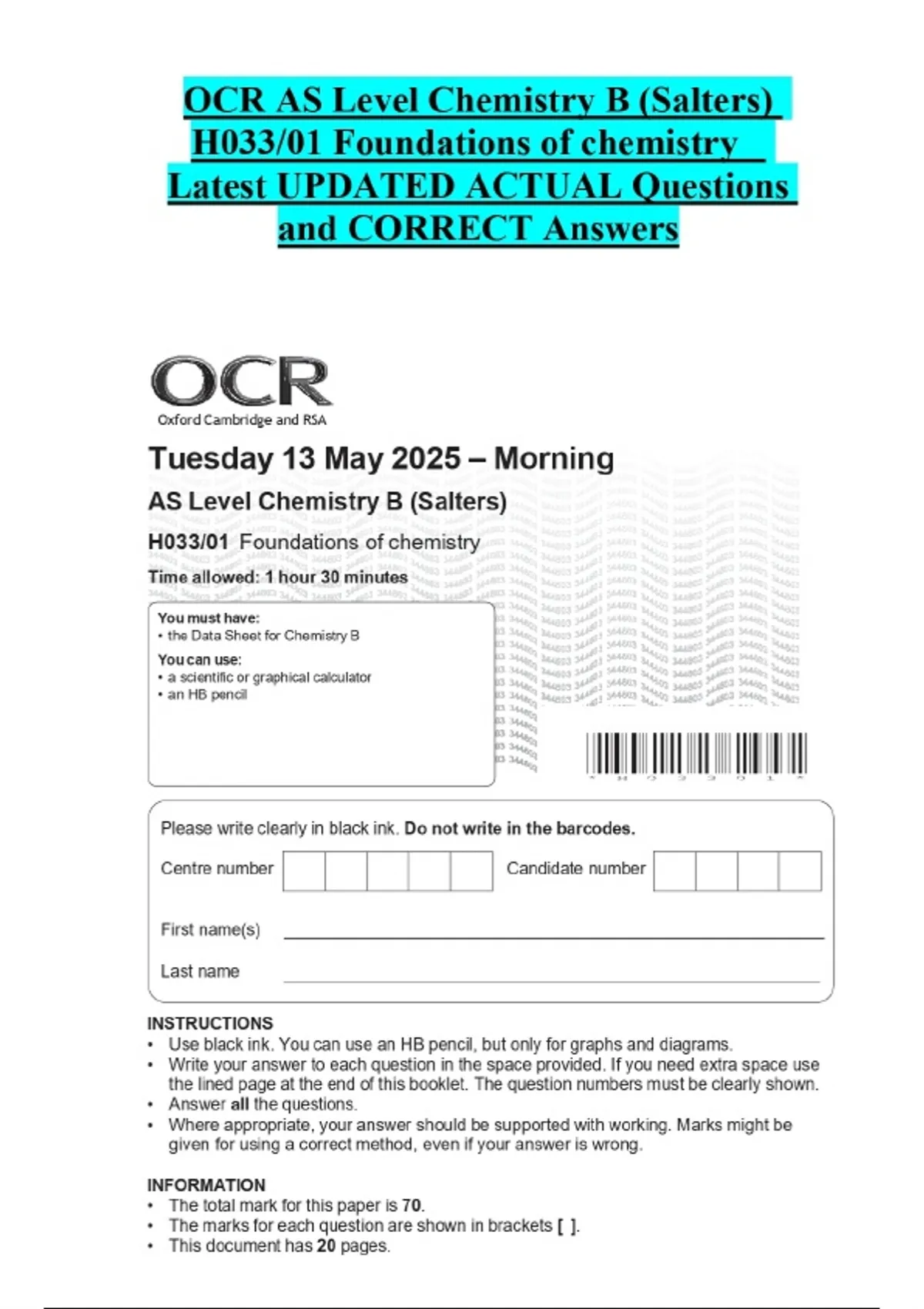 OCR AS Level Chemistry B (Salters) H033/01 Foundations of chemistry Latest UPDATED ACTUAL Questions and CORRECT Answers