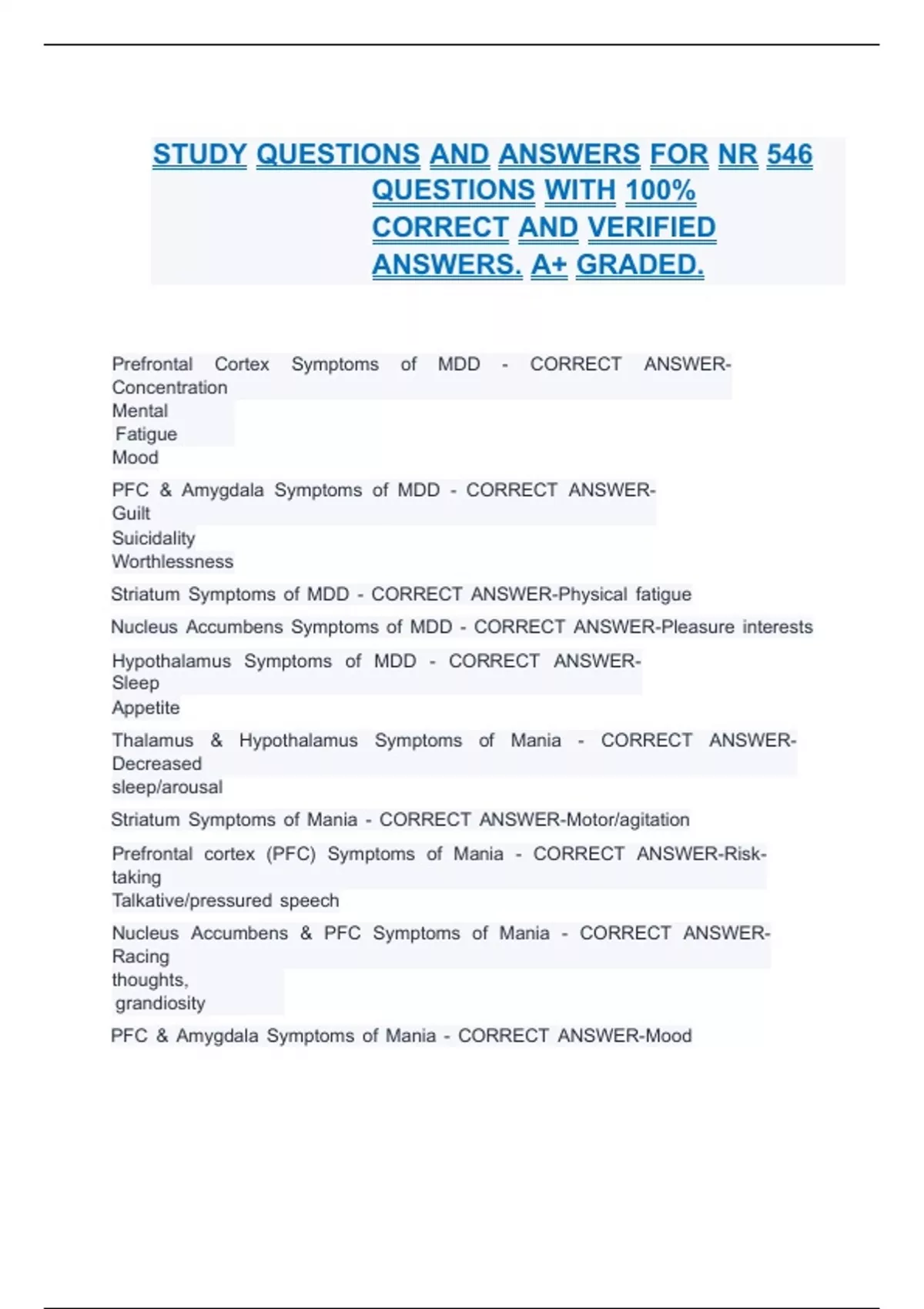 1 Exam (elaborations) CU NR 546 STUDY Exam Newest Actual 2025/2026 With Complete Questions And Answers Verified/Graded A 2 Exam (elaborations) STUDY QUESTIONS AND ANSWERS FOR NR 546 QUESTIONS WITH 100% CORRECT AND VERIFIED ANSWERS. A GRADED. 3 Exam (elaborations) NR 546 CORRECT QUESTIONS AND ANSWERS real exam and complete questions and answers
