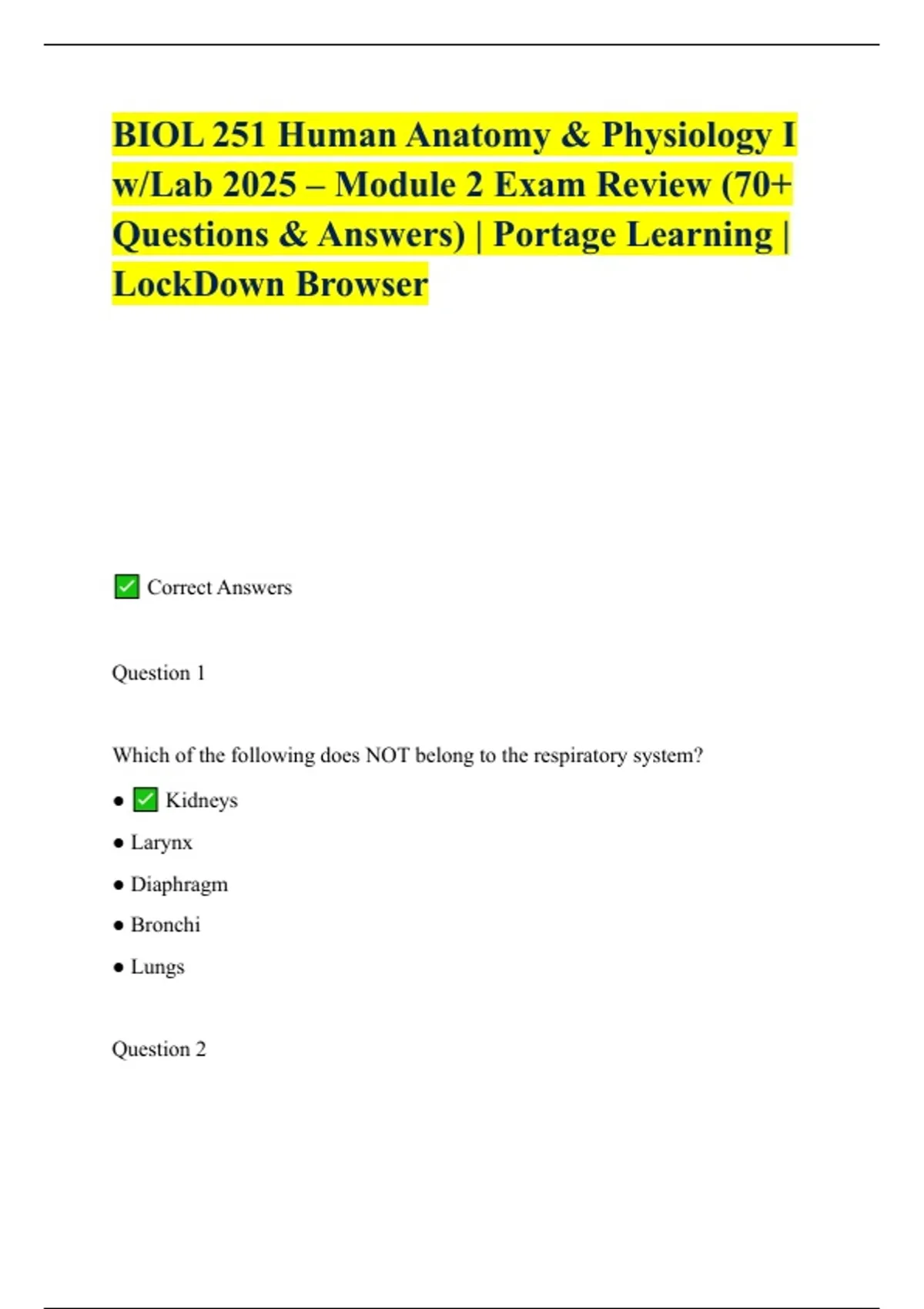 1 Exam (elaborations) BIOD171 or BIOL271 Microbiology w/Lab 2025 |Module 2 Exam Review | LockDown Browser |Portage Learning 2 Exam (elaborations) BIOL 251 Human Anatomy & Physiology I w/Lab 2025 – Module 2 Exam Review (70+ Questions & Answers) | Portage Learning | LockDown Browser 3 Exam (elaborations) BIOL 252 Human Anatomy & Physiology II w/Lab