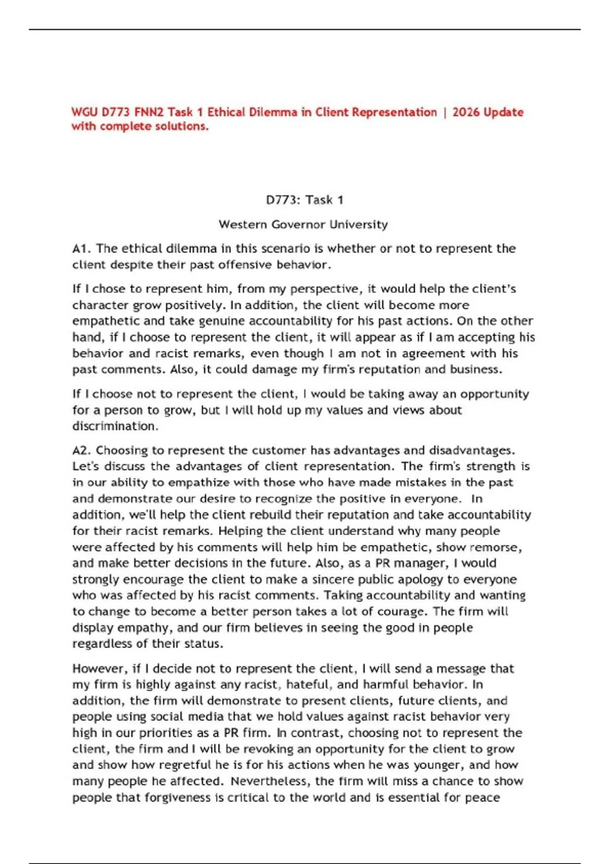 WGU D773 FNN2 Task 2: Ethics and Privacy in Online Banking WGU D773 FNN2 Task 1 Ethical Dilemma in Client Representation