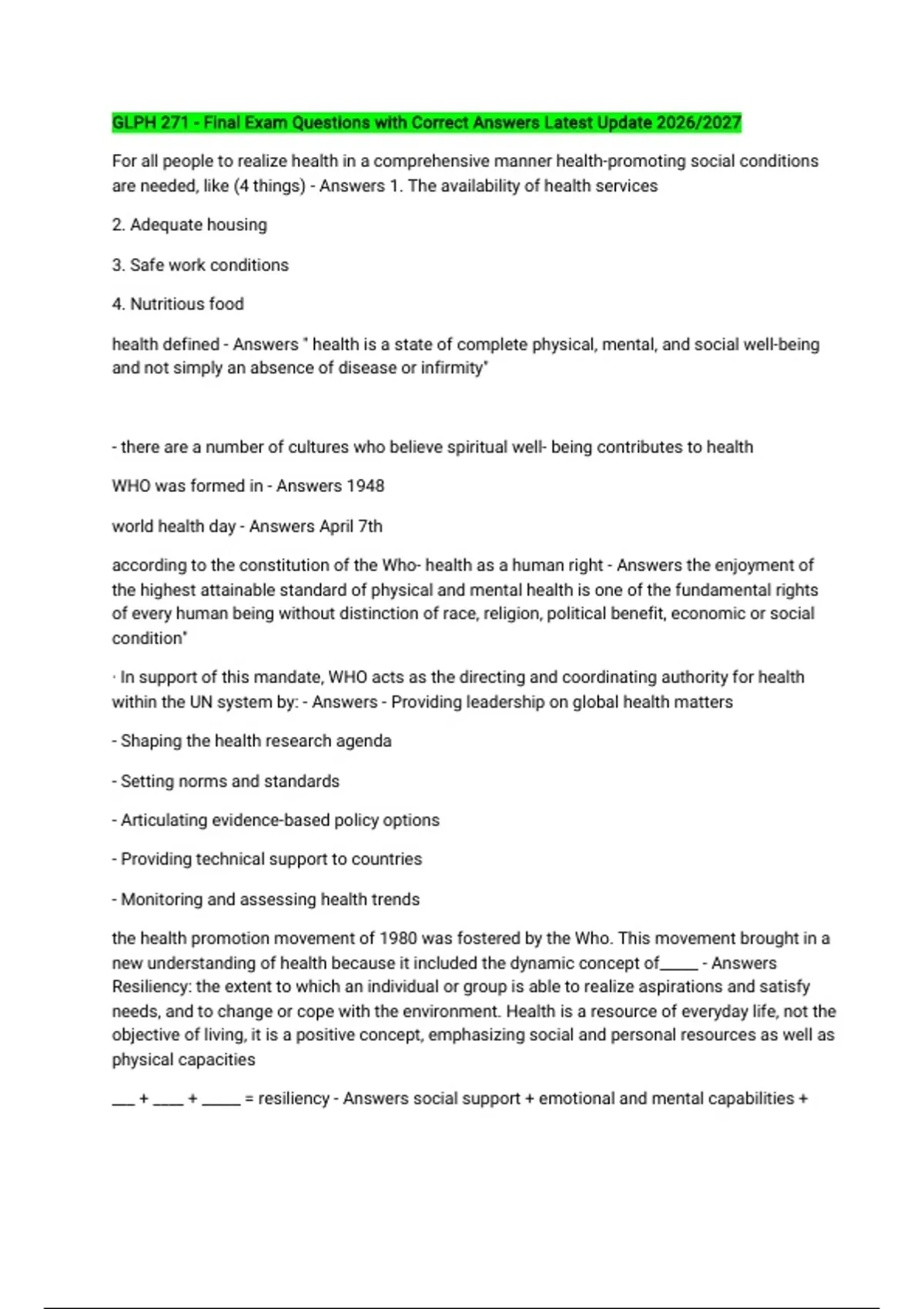 GLPH 271 - Final Exam Questions with Correct Answers Latest Update 2026/2027