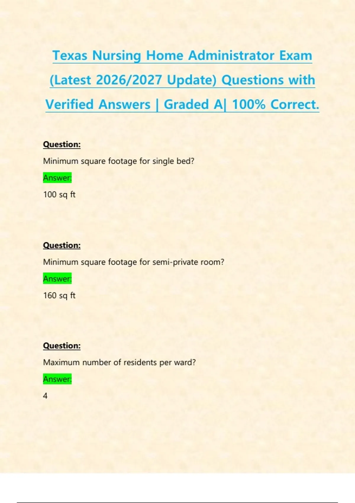 Texas Nursing Home Administrator Exams PACKAGE DEAL| BUNDLE contains the latest exams, test bank with updated study guide- Guaranteed pass.