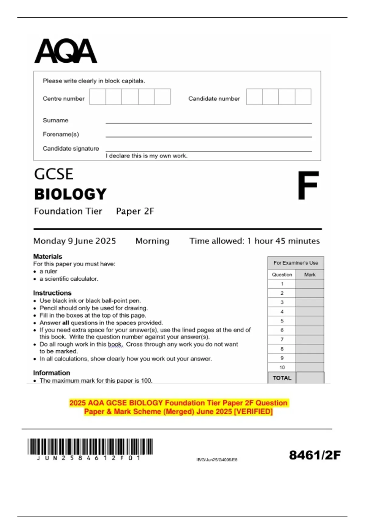 2025 AQA GCSE BIOLOGY Foundation Tier Papers Question Paper & Mark Scheme (Merged) June 2025 [VERIFIED]