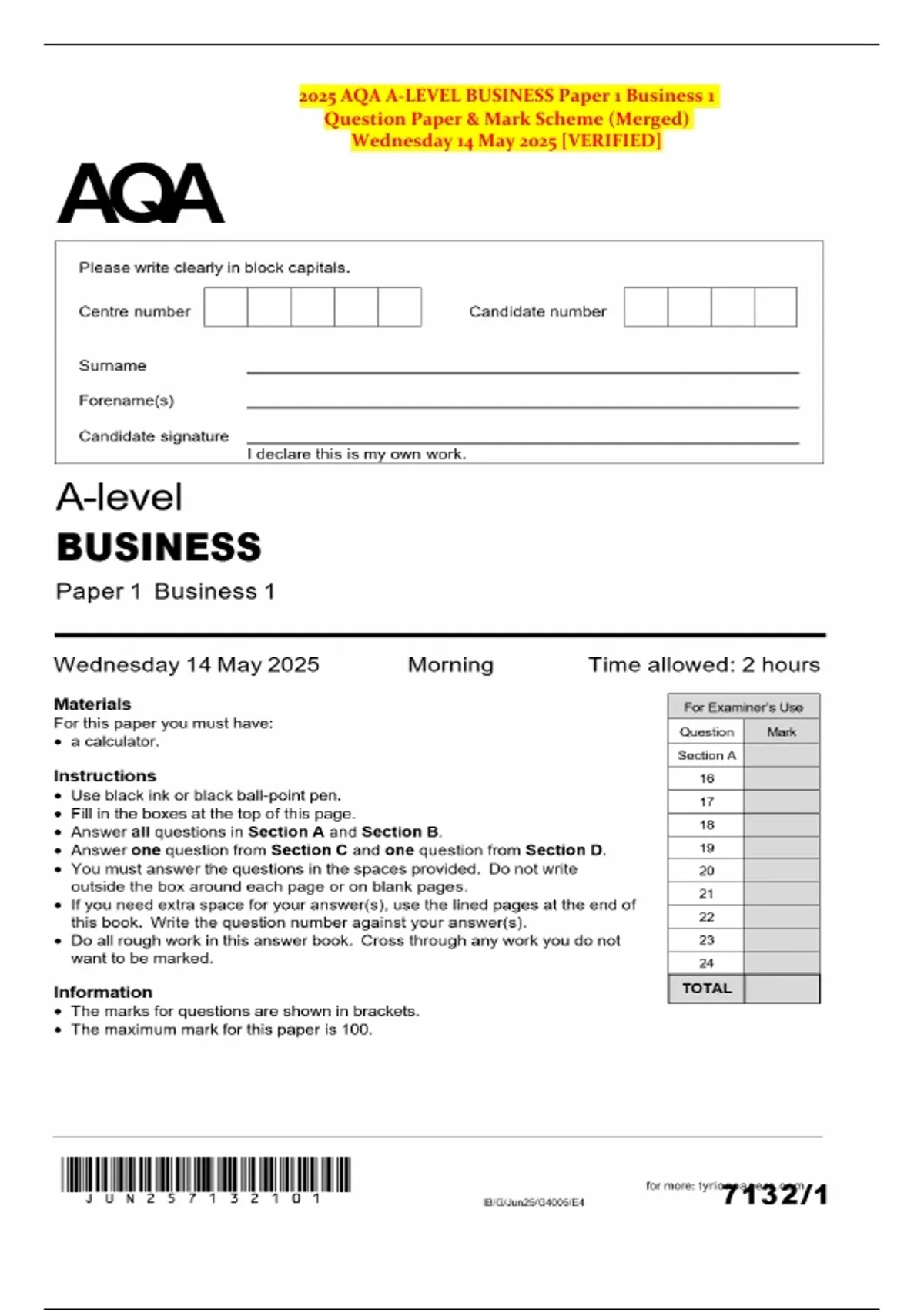 2025 AQA A-LEVEL BUSINESS Paper 1 Business 1 Question Paper & Mark Scheme (Merged) Wednesday 14 May 2025 [VERIFIED]