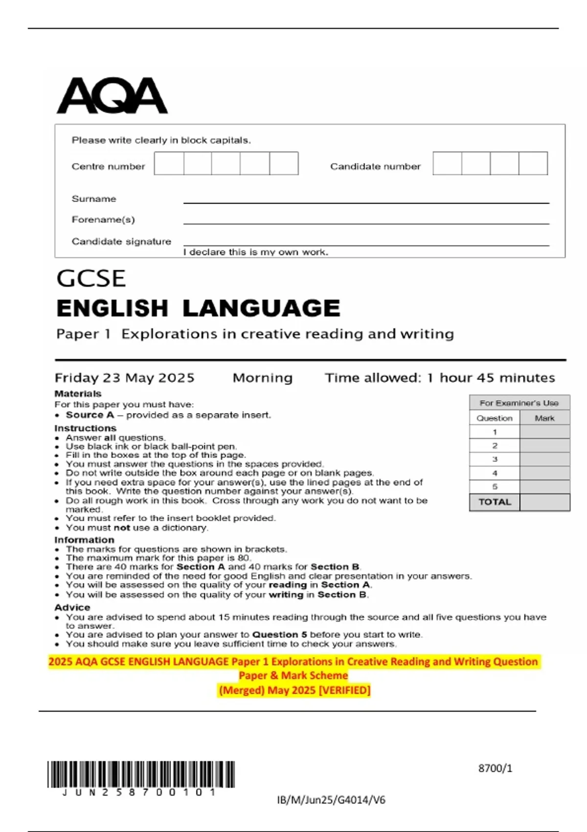 2025 AQA GCSE ENGLISH LANGUAGE Paper 1 Explorations in Creative Reading and Writing Question Paper & Mark Scheme (Merged) May 2025 [VERIFIED]