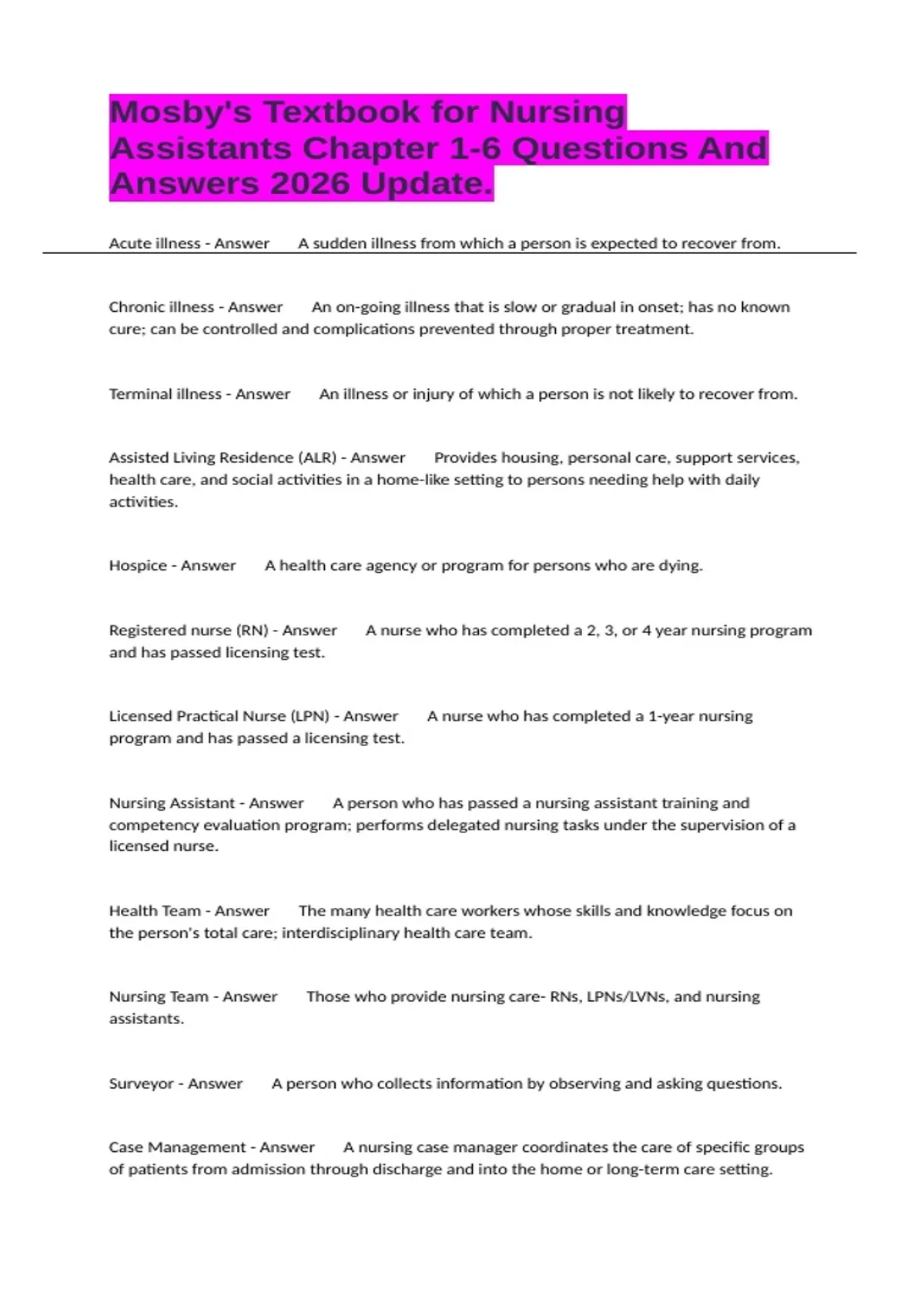 1 Exam (elaborations) Mosby s Textbook for Nursing Assistants – Chapter 4, Chapter 5 (Workbook) And Chapter 6 Questions and Correct Answers 2026 Updated. 2 Exam (elaborations) Mosby s Essentials for Nursing Assistants Chapter 15, Chapter 16 And Chapter 17 (Workbook) Test Questions with Solutions 2026 Updated. 3 Exam (elaborations) Mosby s Textboo