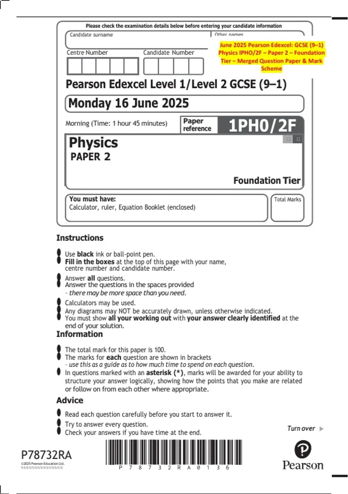 This bundle includes all May–June 2025 Pearson Edexcel GCSE (9–1) Physics (IPHO) examination question papers — covering Paper 1 and Paper 2 for Foundation Tier — together with their official mark schemes. It provides students with a complete and reliable resource for focused revision, exam practice, and preparation for success in GCSE Physics.