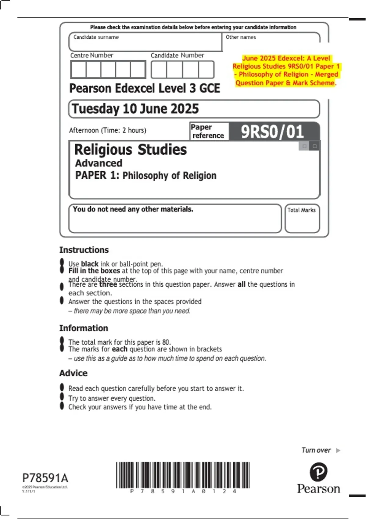 June 2025 Edexcel A Level Religious Studies 9RS0 | Combined Question Papers & Mark Schemes.