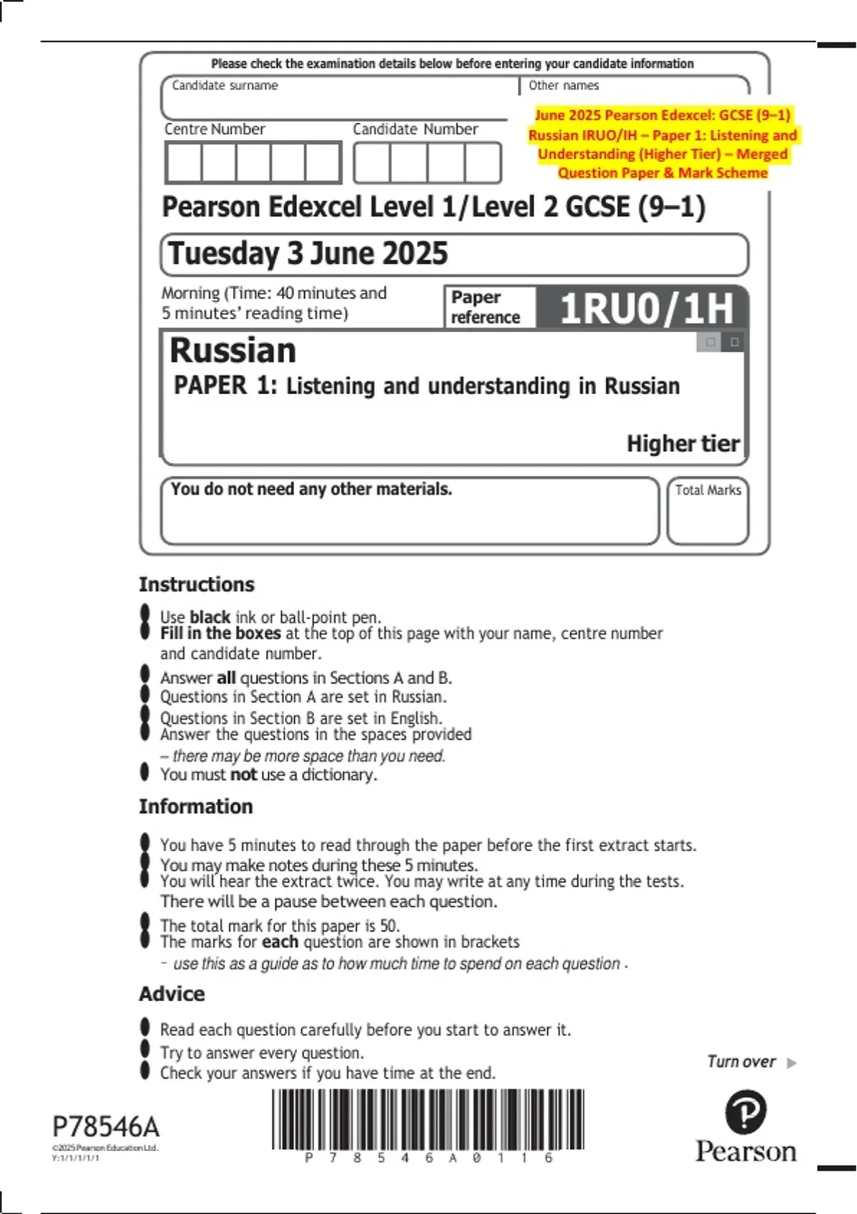 June 2025 Pearson Edexcel GCSE Russian | Higher Tier – Combined Question Papers & Mark Schemes.