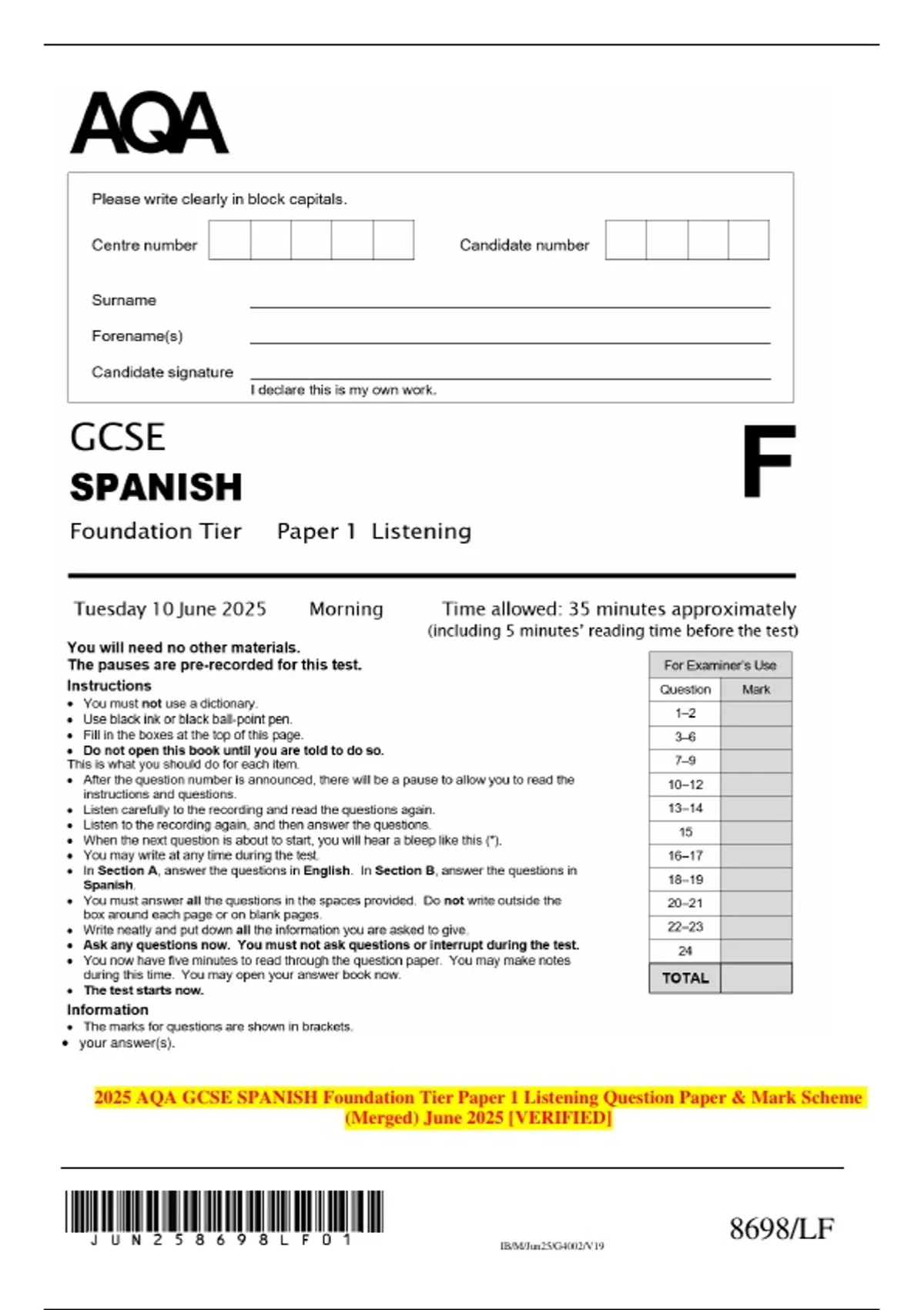 June 2025 AQA GCSE Spanish Foundation Tier | Combined Question Papers & Mark Schemes.