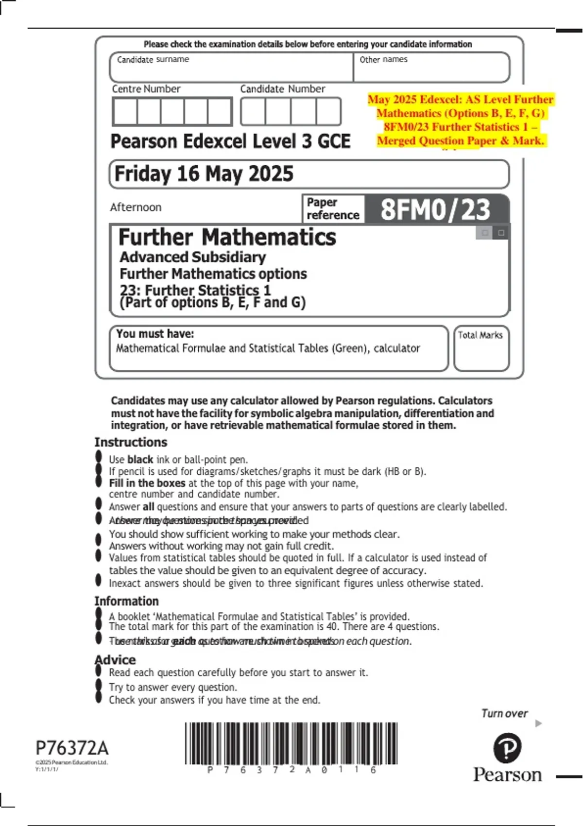 This bundle includes all May 2025 Edexcel AS Level Statistics and Further Statistics examination papers — covering AS Level Further Mathematics 8FM0/23 Further Statistics 1, 8FM0/24 Further Statistics 2 (Option G only), and AS Level Mathematics 8MA0/21 Statistics together with their official mark schemes. This complete collection provides student.
