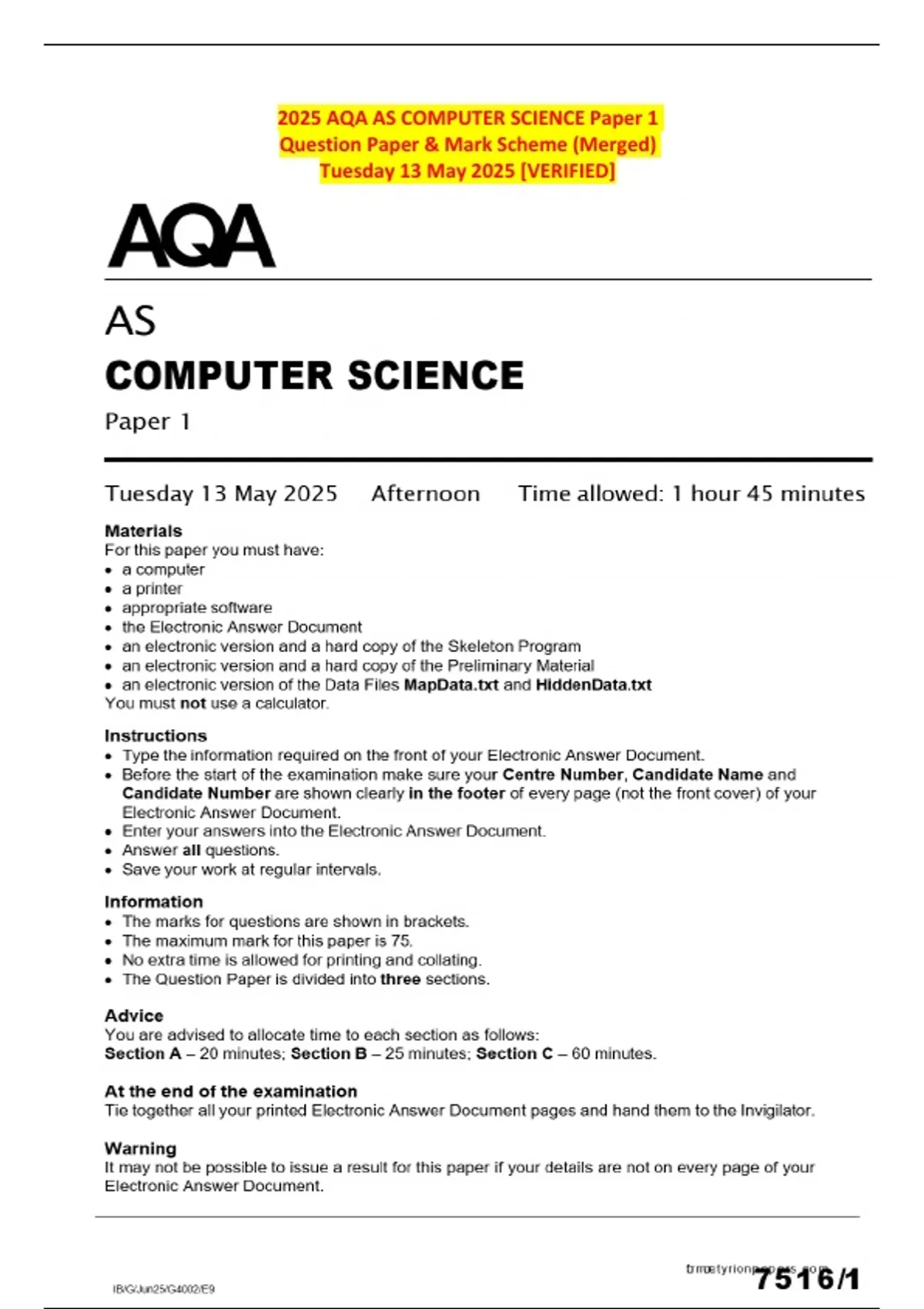 This bundle includes all May 2025 AQA AS Computer Science examination question papers — covering Paper 1 and Paper 2 — along with their official mark schemes. Perfect for students preparing for AS-level computer science, this complete collection provides a reliable resource for focused revision