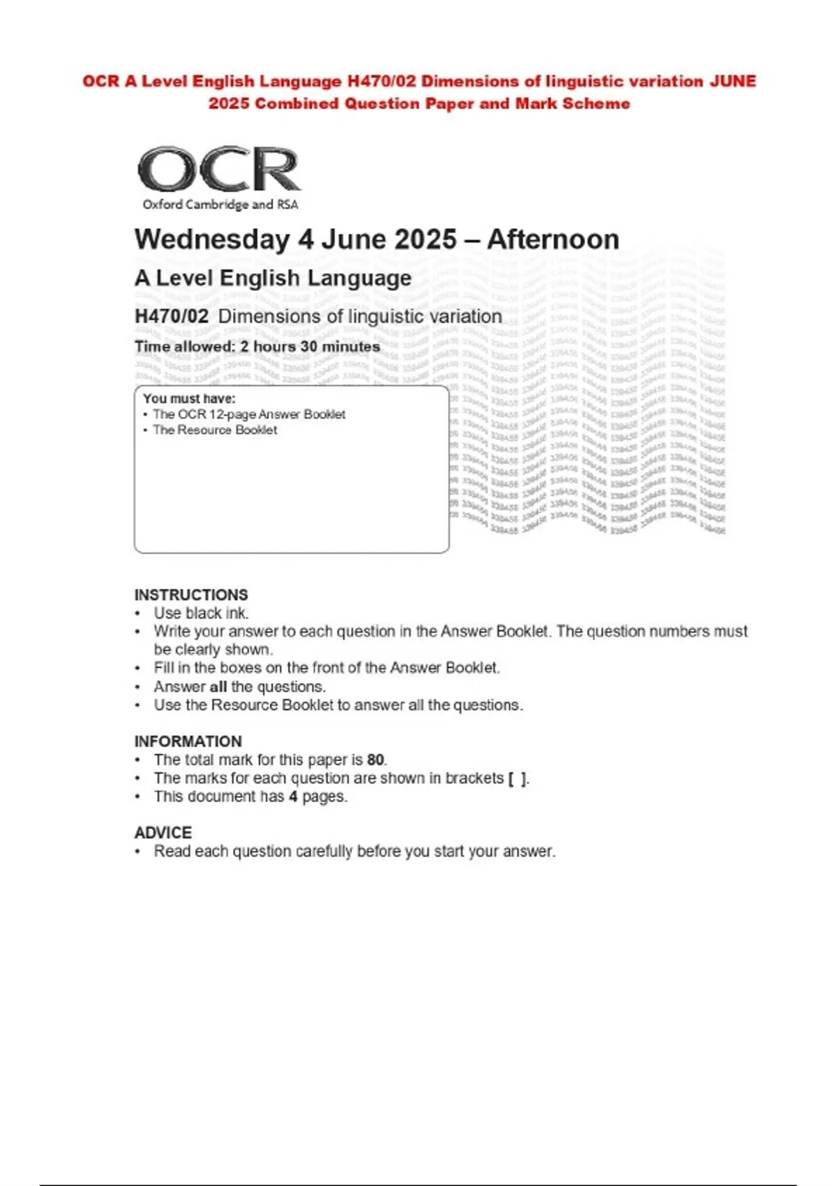 OCR A Level English Language H470/02 Dimensions of linguistic variation JUNE 2025 Combined Question Paper and Mark Scheme