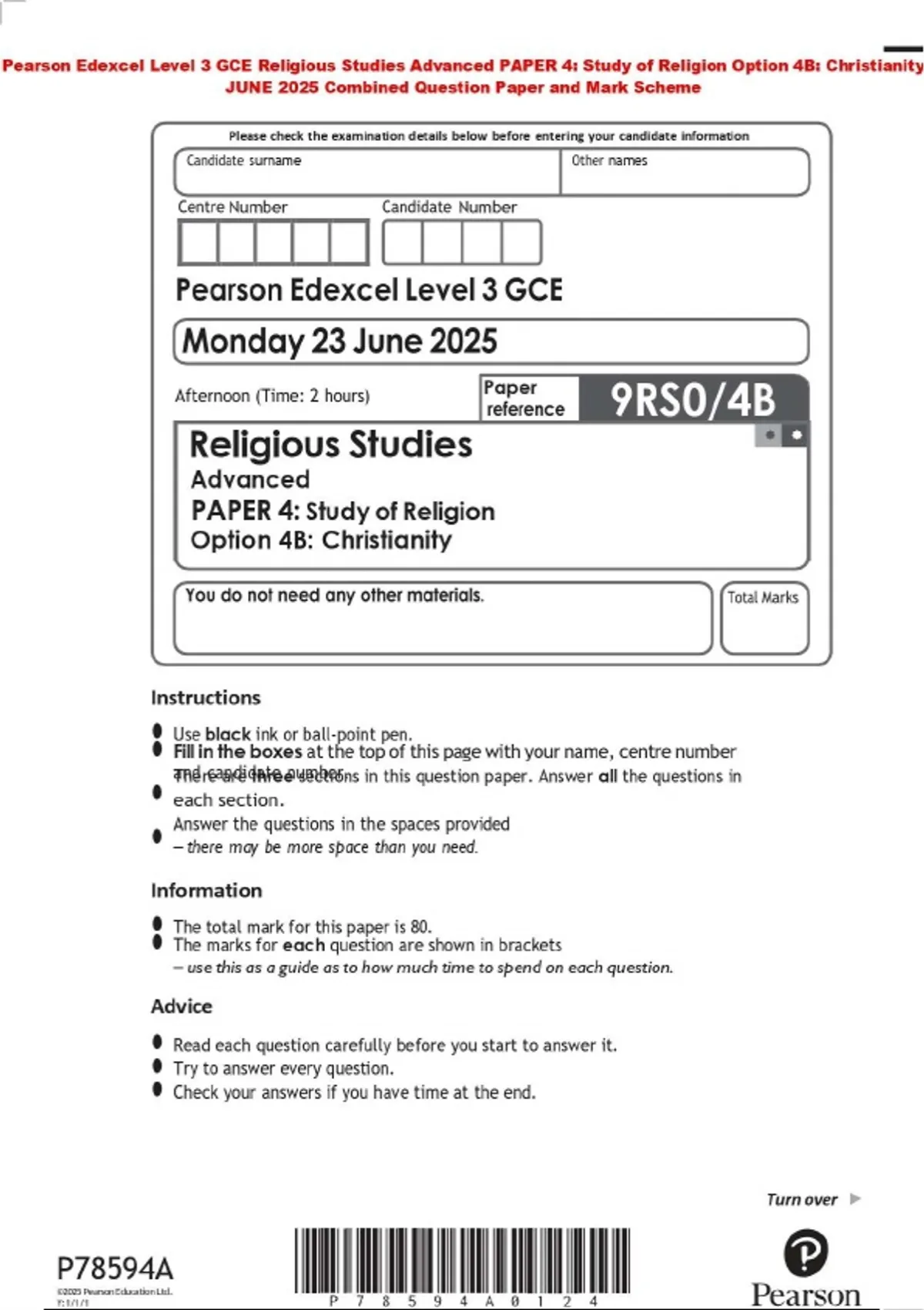 Pearson Edexcel Level 3 GCE Religious Studies Advanced PAPER 4: Study of Religion Option 4B: Christianity JUNE 2025 Combined Question Paper and Mark Scheme
