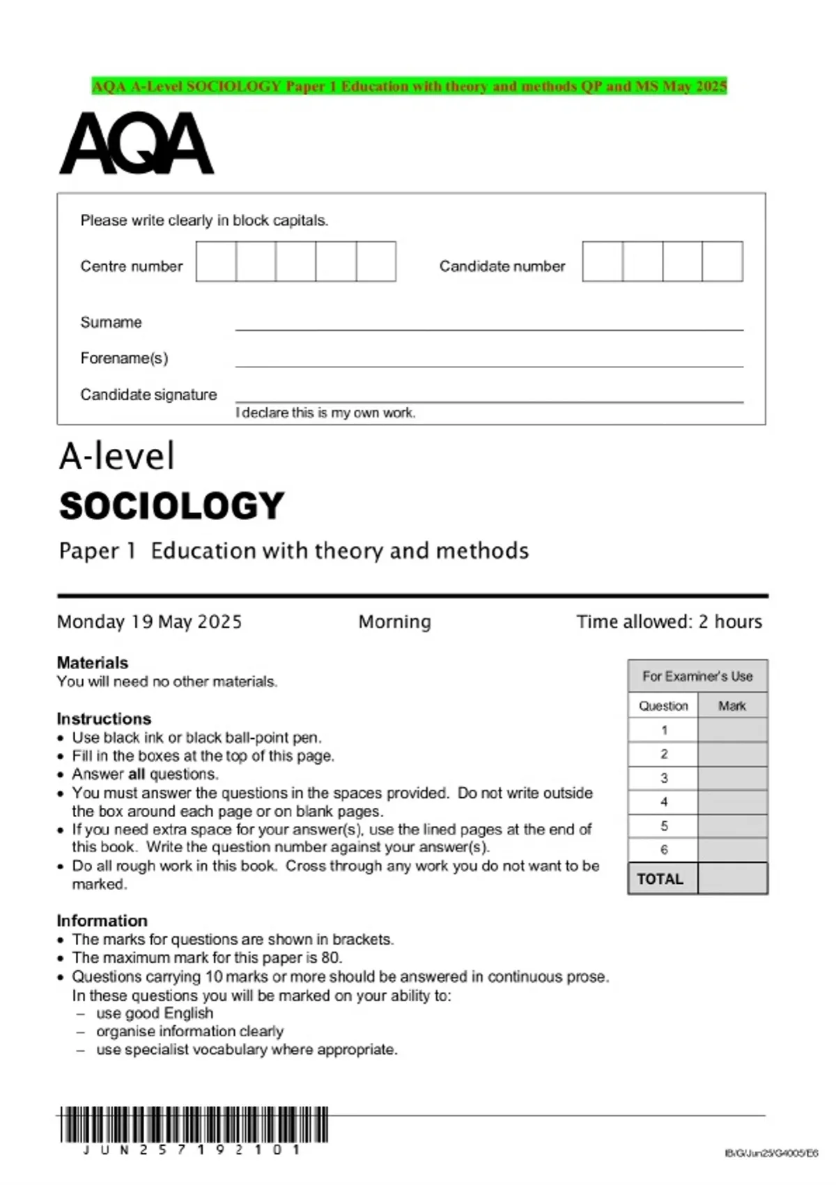 AQA A-Level SOCIOLOGY Paper 1 Education with theory and methods QP and MS May 2025
