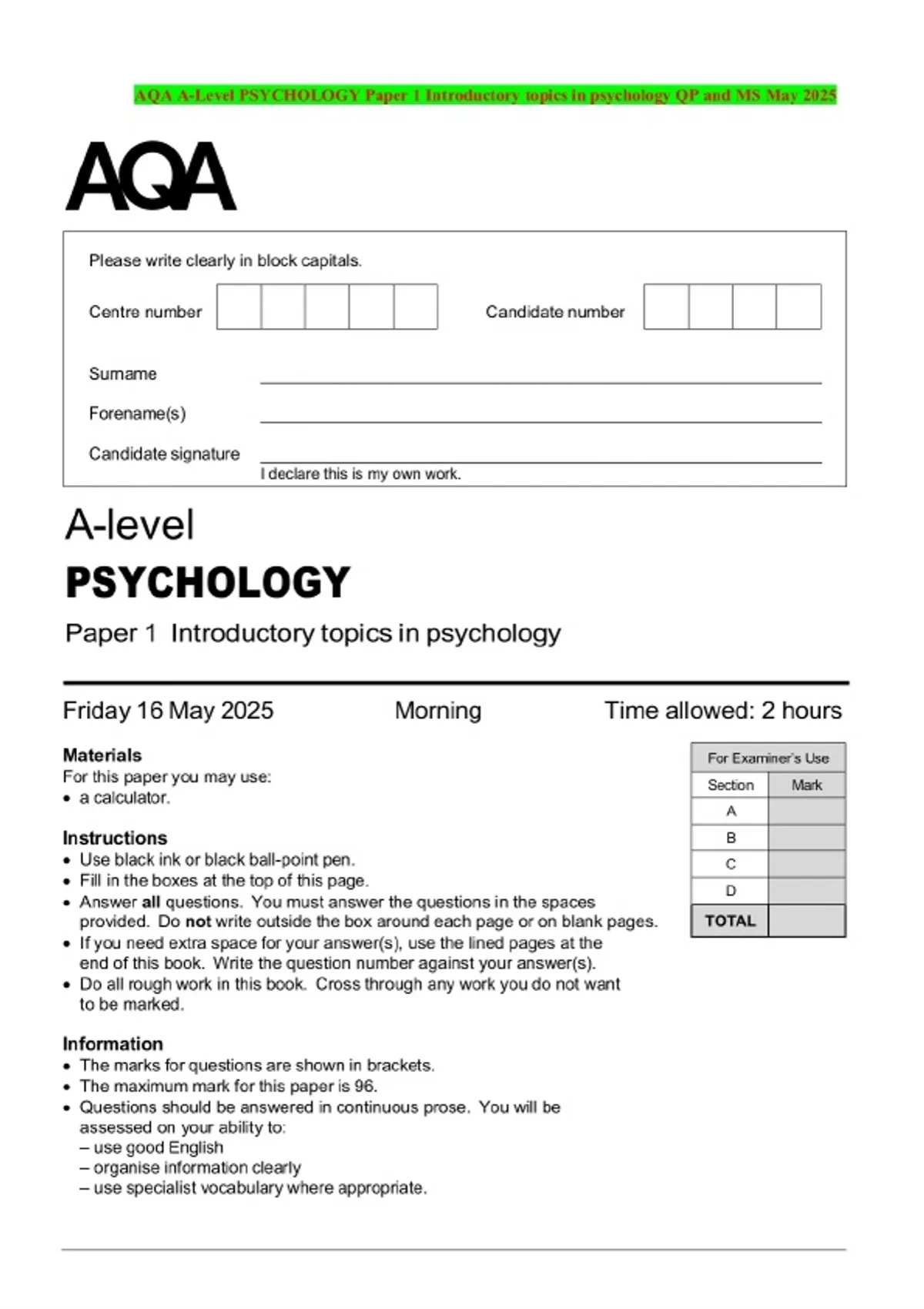 AQA A-Level PSYCHOLOGY Paper 1 Introductory topics in psychology QP and MS May 2025
