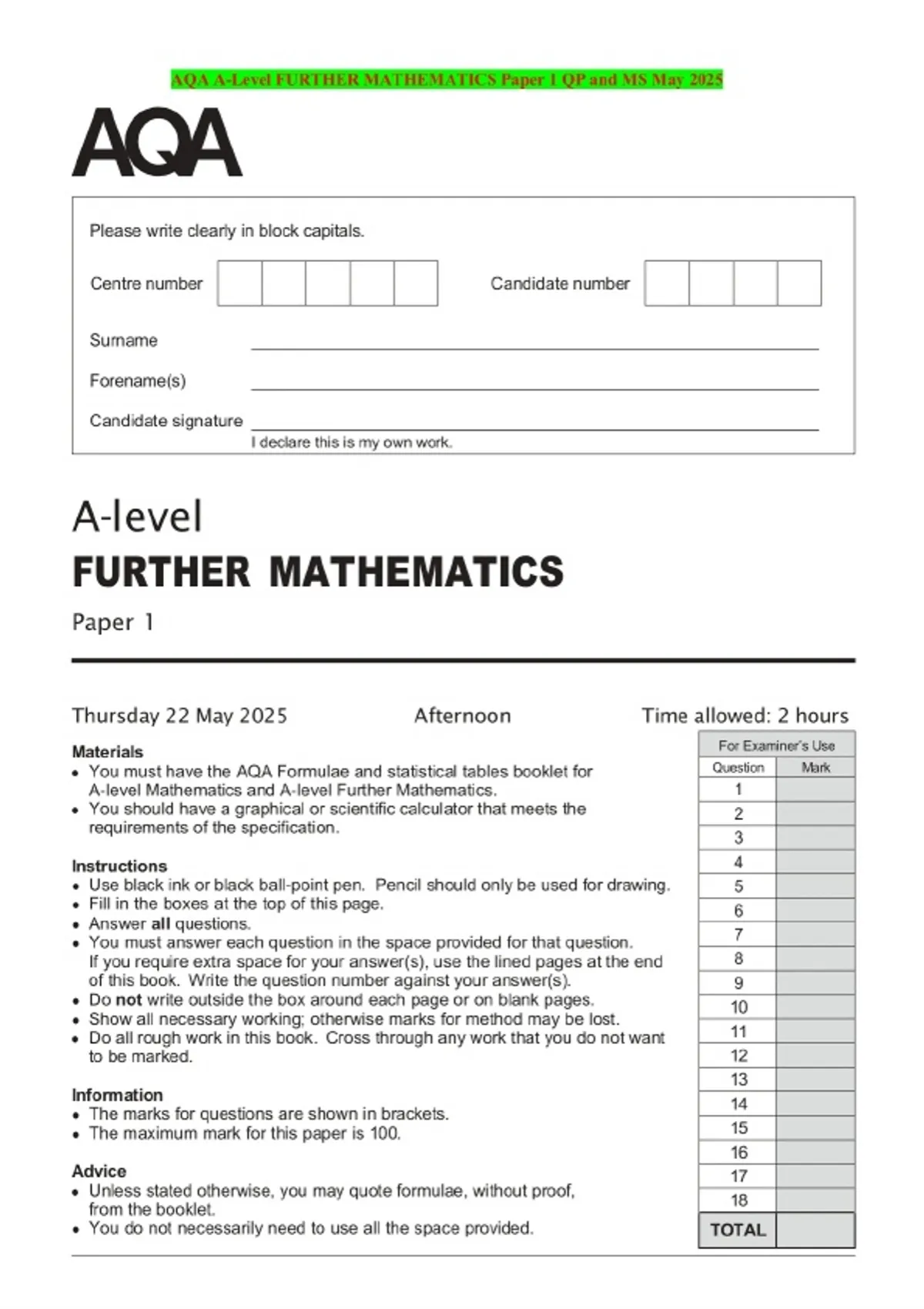 AQA A-Level FURTHER MATHEMATICS Paper 1 QP and MS May 2025