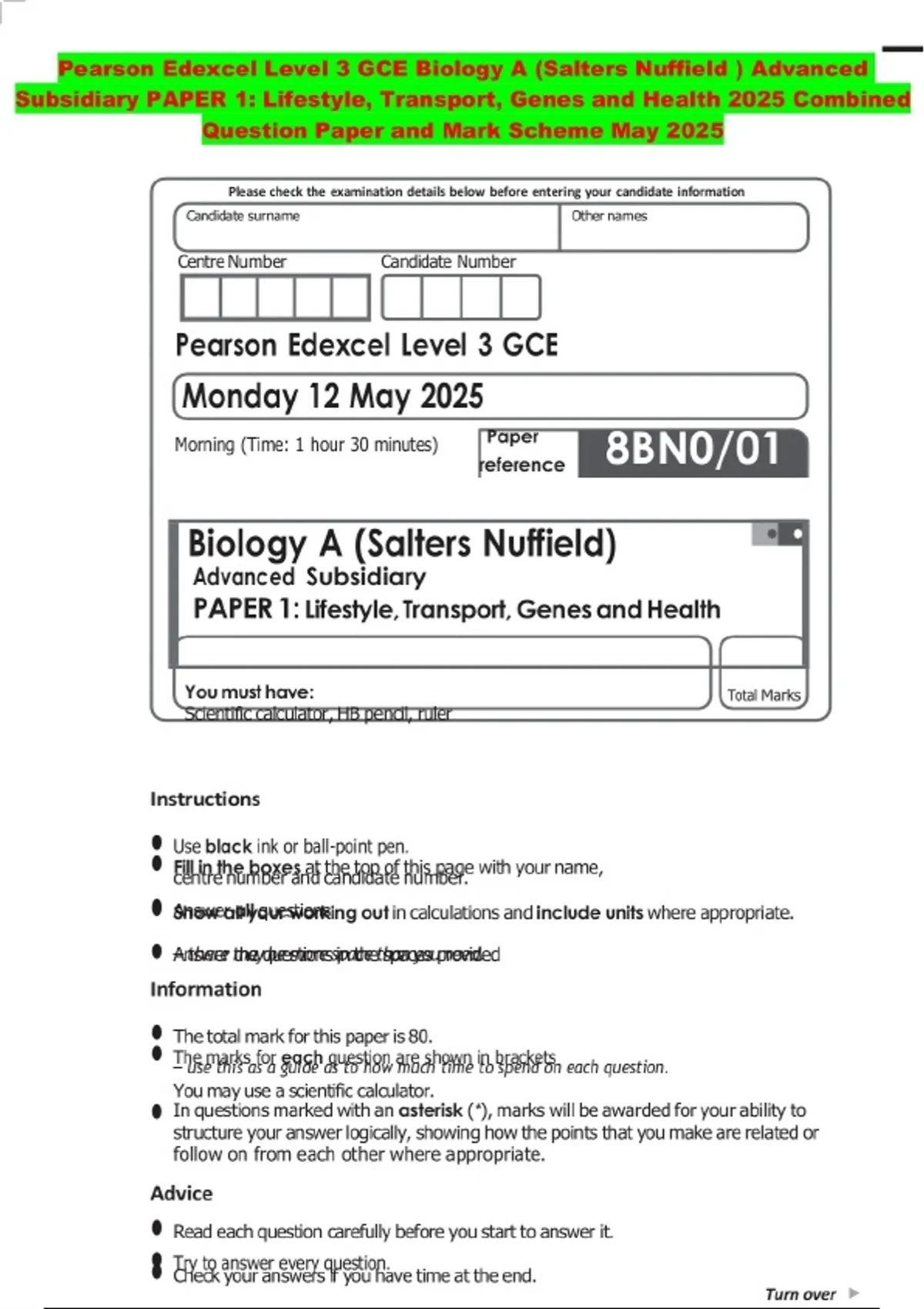 Pearson Edexcel Level 3 GCE Biology A (Salters Nuffield ) Advanced Subsidiary PAPER 1: Lifestyle, Transport, Genes and Health 2025 Combined Question Paper and Mark Scheme May 2025