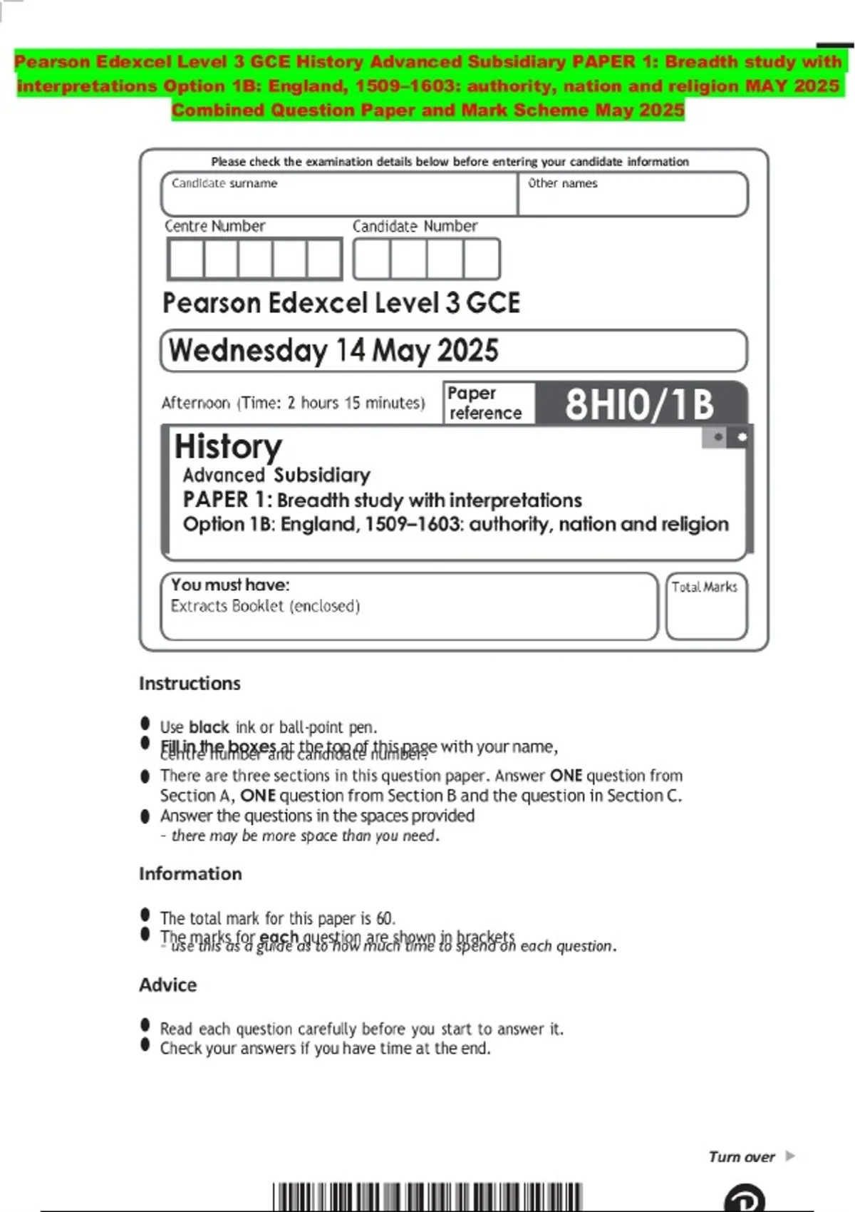 Pearson Edexcel Level 3 GCE History Advanced Subsidiary PAPER 1: Breadth study with interpretations Option 1B: England, 1509–1603: authority, nation and religion MAY 2025 Combined Question Paper and Mark Scheme May 2025