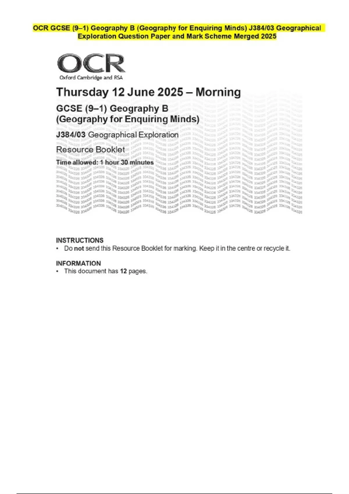 OCR GCSE (9–1) Geography B (Geography for Enquiring Minds) J384/03 Geographical Exploration Question Paper and Mark Scheme Merged 2025