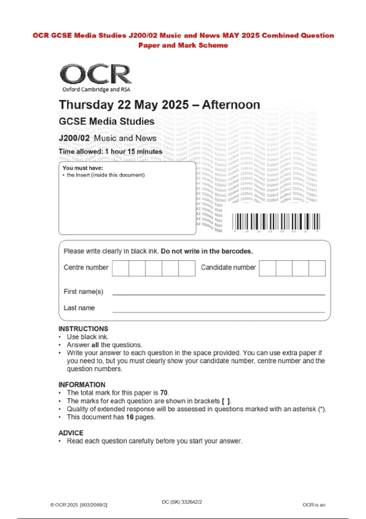 PACKAGE DEAL::: OCR GCSE Media Studies 2025 Merged Question Paper and Final Mark scheme