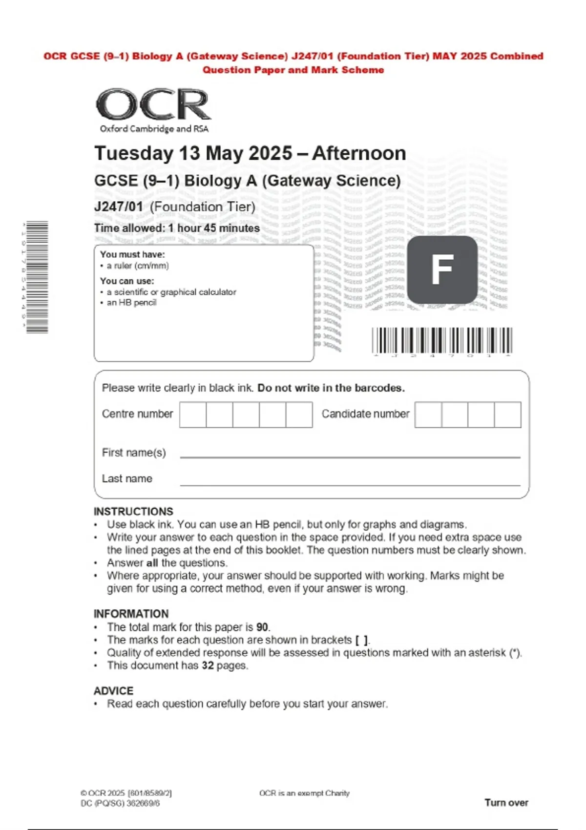 OCR GCSE (9–1) Biology A (Gateway Science) J247/01 (Foundation Tier) MAY 2025 Combined Question Paper and Mark Scheme